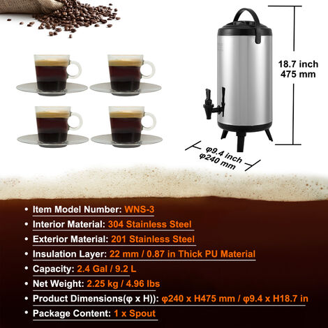 Distributeur De Boissons Isotherme Thermos Grande Capacité Distributeur Boisson VEVOR s, 9 Litres, Serveur Distributeur Boisson Isotherme Grand Thermos Thermos Portable événement Extérieur Pinnacle Platino 3 Gallon (12 Litre) Distributeur de boissons isotherme Distributeur d'Eau Chaude Isotherme avec Robinet - Réservoir Boisson en Acier Inoxydable 10L à 80L, pour Café, Thé, Fêtes, Bureau ou Camping - Usage... Design pliant, gain de place: Son corps pliant et son bec verseur réglable en hauteur permettent un rangement compact sans compromettre la stabilité du débit. Robinet hygiénique et antifuite: Équipé d'un robinet en ABS de qualité alimentaire et amovible, ce distributeur se nettoie facilement au lave-vaisselle pour une hygiène parfaite. Son système d'étanchéité fiable prévient toute goutte, garantissant une utilisation propre et idéale pour les réunions familiales ou un usage professionnel en restauration. Distribution pratique, température idéale: Ce distributeur de boissons isotherme utilise une double paroi en acier inoxydable sous vide pour maintenir efficacement la température des liquides, qu'ils soient chauds ou froids. Isolation performante, fraîcheur durable: Machine à boire en acier inoxydable avec réservoir d'eau inodore et écologique intégré et technologie d'isolation sous vide, retarde efficacement la perte de température, les boissons chaudes et froides peuvent être conservées longtemps. La conception du réservoir étanche évite le gaspillage et permet aux boissons de fête d'être toujours fraîches comme au début. Son encombrement réduit lui permet de trouver sa place partout, que ce soit dans un coffre de voiture pour un pique-nique ou dans un coin cuisine pour une réception, garantissant un service de boissons professionnel en toutes circonstances. Découvrez notre gamme de Thermos Café et Distributeur Isotherme spécialement étudiée pour la restauration. Élément essentiel du matériel de restauration, le Thermos est le produit idéal pour conserver au chaud une boisson comme le café