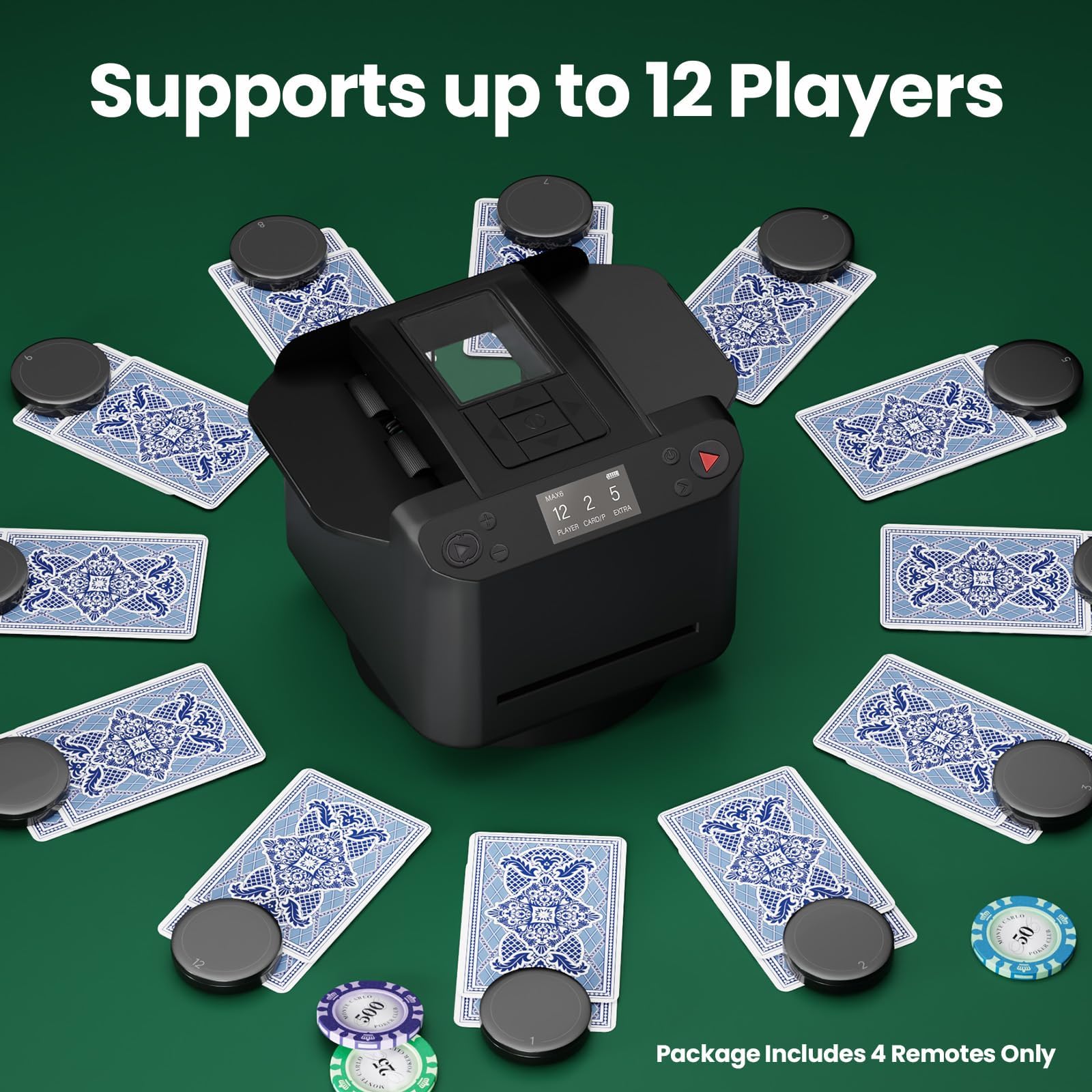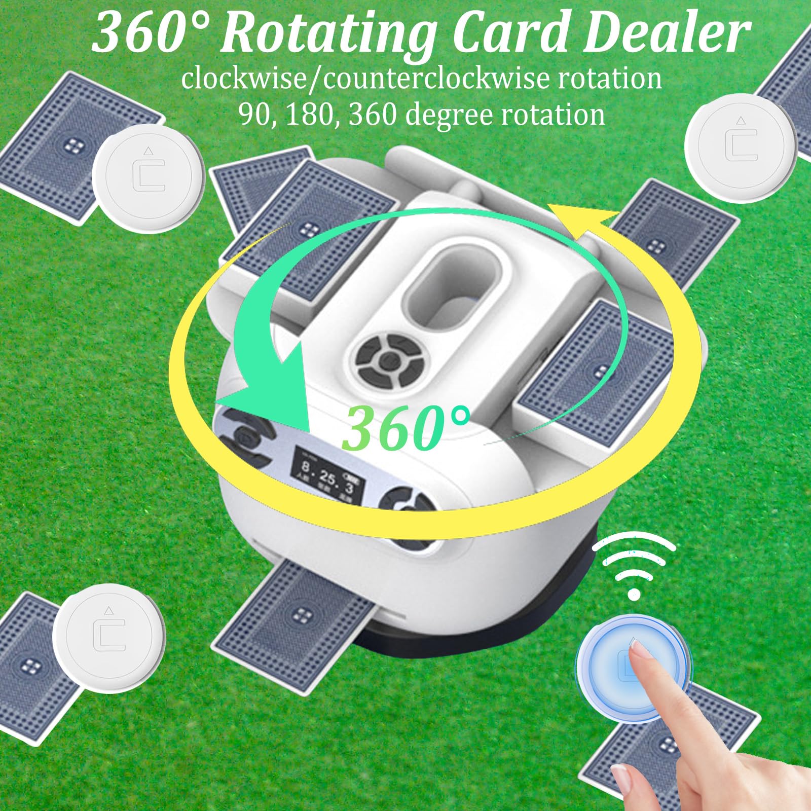 Acheter ICI un mélangeur de cartes pour jusqu'à 6 jeux Distribution de cartes plus intelligente – Distribution automatique en une seule touche pour jusqu'à 8 joueurs ; rotation à 180° ou 360° pour éviter la... Distributeur Cartes Jeu Automatique Mélangeur Distributeur De Carte électronique Distributeur De Cartes Automatique, Distributeur De Cartes à 2 Ponts Rotatifs à 360 Distributeur Cartes Melangeur De Carte Manuelle La séquence suivante : carte du bas en premier ou en dernier, carte du bas, nombre de joueurs, nombre de cartes, sens horaire ou antihoraire, jeu continu, paramètres., 3., Réglez la valeur numérique en appuyant sur les touches + ou -., 4., Lorsque le nombre de joueurs est de 3, après avoir défini le nombre de parties continues, les options de distribution alternée et de distribution tournante s'affichent., 5., Appuyez sur la touche OK pendant plus de 2 secondes pour confirmer et quitter le mode de configuration. Distribution de cartes plus intelligente – Distribution automatique en une seule touche pour jusqu'à 8 joueurs ; rotation à 180° ou 360° pour éviter la triche et garantir un jeu équitable. Mélangeur Carte Distributeur Automatique 2 En 1 Et Mélangeur De Cartes, Flexibilité De 2 à 8 Joueurs, Rotation à 360 ° Avec 4 Télécommande Sans Fil... Contenu :1 x Mélangeur de cartes automatique1 x Câble de chargement Compatibilité multi-jeux – Peut contenir jusqu'à 2 jeux (108 cartes), compatible avec les jeux de poker standard, de bridge, UNO, Blackjack, Texas Hold'em et plus encore. Rechargeable et durable – La batterie rechargeable intégrée de 2 500 mAh permet d'utiliser jusqu'à 400 jeux complets par charge ; elle est équipée d'un capteur autonettoyant pour une performance longue durée. Paramètres personnalisables – Ajustez les joueurs, le nombre de cartes, la séquence de distribution, la rotation horaire ou antihoraire et les options de base pour une flexibilité maximale.