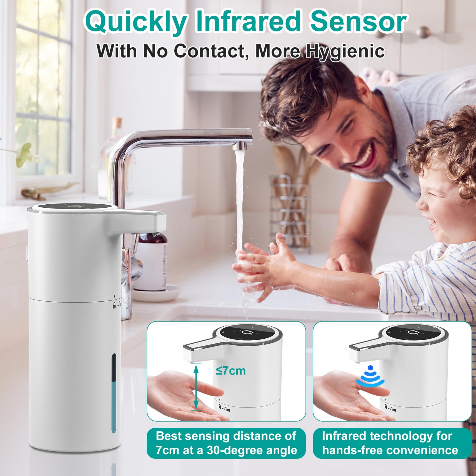 Éteignez l'appareil, nettoyez la zone de détection et redémarrez-le. Notre distributeur de savon mousse est doté d'une technologie de moussage automatique, rendant le lavage des mains plus pratique que jamais. Détecte-t-il les éponges ou les ustensiles ? Il détecte la plupart des éponges et des gants en caoutchouc, mais pas toutes les couleurs ; les couleurs claires sont recommandées. Pas besoin de toucher ou d'appuyer sur la pompeRechargeable par USB : notre distributeur de savon est livré avec une batterie lithium-ion intégrée qui peut être chargée. En utilisant le câble USB fourni (inclus dans l'emballage), le distributeur de savon peut être complètement chargé en 2 heures Disponible en version murale ou sur plan de travail, il ne nécessite aucun perçage pour un gain de place et est idéal pour les petits espaces [Affichage numérique intelligent et distribution de savon sur 4 niveaux] Affichage en temps réel du niveau de batterie restant et du mode de distribution actuel. Distributeur automatique de savon liquide 400Ml, capteur infrarouge... Idéal pour réduire le gaspillage [Fonctionnement sans contact et temps de réponse rapide de 0,25 s] Ce distributeur de savon automatique est équipé de capteurs infrarouges avancés. Distributeur Intelligent Salle De Bain Ipx5 Distributeur De Savon Automatique Sans Contact 400 Ml En Mousse Pour Lavage Des Mains Montage Mural Electrique Avec Chargement Usb 92483194 Batterie 1800mAh 6000 Utilisations Le corps du flacon et la tête de pompe intelligente sont entièrement amovibles. Ce distributeur de savon d'une capacité de 400 ml est doté d'une fenêtre visible pour vérifier le niveau de savon restant. Il convient à divers environnements tels que la salle de bain, la cuisine, le bureau, l'hôtel, la maison, l'école et le restaurant Il s'adapte à une grande variété de savons, notamment du liquide vaisselle, du gel douche, du shampoing, du gel hydroalcoolique et du nettoyant visage. [Étanchéité IPX5 et double installation] Ce distributeur de savon intelligent, certifié IPX5, résiste aux éclaboussures dans les cuisines et salles de bains. [Grande capacité de 400 ml et compatibilité universelle] Ce distributeur de savon sans contact offre une capacité allant jusqu'à 400 ml et une fenêtre visible pour une surveillance facile, évitant ainsi les remplissages fréquents. Ce distributeur de savon est doté d'une large ouverture pour faciliter l'ajout de savon. Une fois complètement chargé, veuillez bien couvrir le bouchon en silicone pour éviter toute pénétration d'eau. Transformer votre maison avec ce distributeur de savon automatique améliore non seulement la fonctionnalité, mais ajoute également une touche d'élégance à votre plan de travail. Le distributeur automatique de savon mousse sans contact PUGTOW est plus pratique : il permet d'obtenir une mousse riche et précise sans toucher le savon ni appuyer sur la pompe. Avec ses 4 niveaux de mousse réglables, ce distributeur automatique de savon pour les mains vous permet de personnaliser la quantité de savon distribuée selon vos préférences et vos besoins. Comment remplir de savon ce distributeur ? Il suffit de tourner vers la droite pour l'ouvrir et le remplir. Distributeur automatique de savon électrique de 40... – Grandado Notre distributeur de savon électrique offre 4 niveaux de mousse, vous permettant de personnaliser la quantité de savon distribuée d'une simple pression sur une touche.