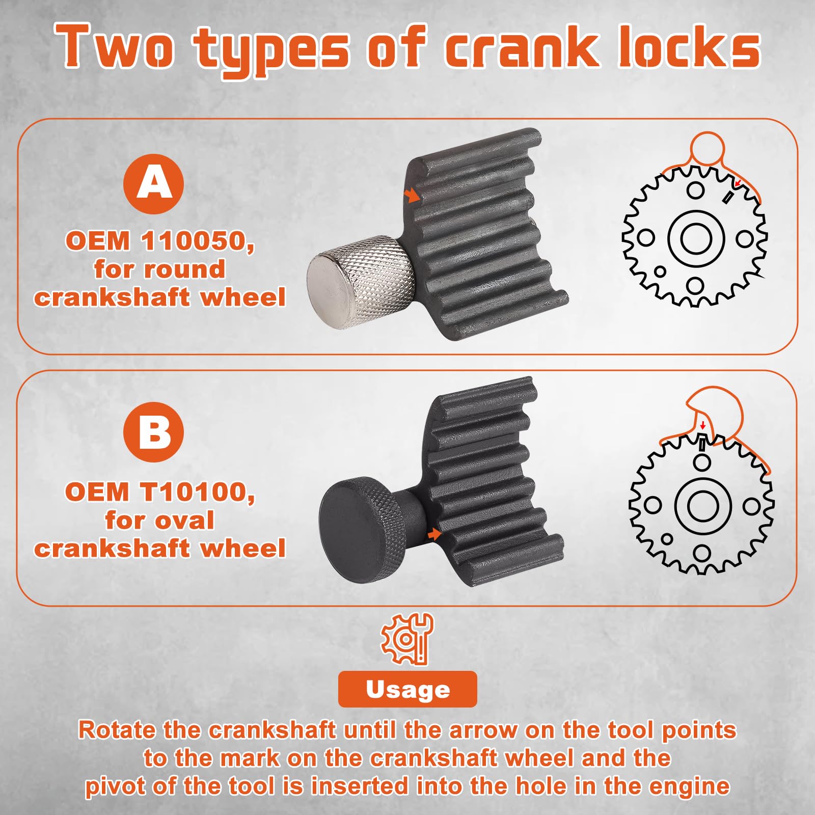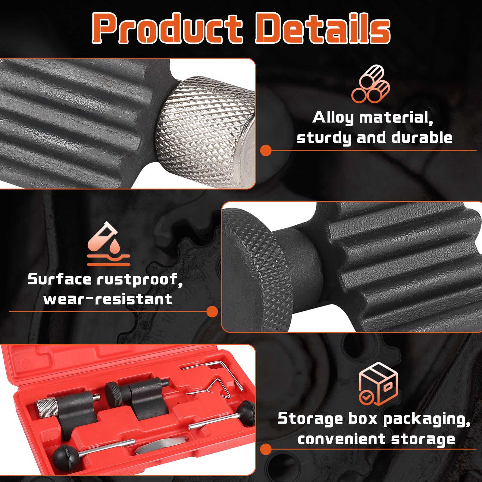 Il comprend 6 outils pro : broches, mandrin, goupille et deux bloqueurs de vilebrequin (ronde et ovale). Compatible avec les moteurs 1.2, 1.4, 1.6, 1.9 et... Vilebrequin Type A pour pignon rond à 12 heures sur les moteurs percés (T10050) ; Type B pour pignon ovale à 1 heure sur les moteurs non percés (T10100) ; Arbre à cames pour bloquer les cames et la pompe à carburant ; Outil pour courroie serpentine (en forme de L) pour bloquer le tendeur de la courroie trapézoïdale (alternateur) dans le piston de compression ; Tendeur triangulaire pour bloquer le tendeur de la courroie de distribution dans le piston de compression Contenu de l'Emballage : Le kit de calage distribution contient 2 x verrous de vilebrequin, 2 x goupilles de synchronisation d'arbre à cames/pompe à injection (extrémité sphérique), 1 x outil de courroie serpentine (goupille en L), 1 x goupille (avec poignée triangulaire), 1 x goupille de verrouillage de tendeur de courroie auxiliaire. Boîte Rangement Bleue Atelier Mécanique Kit Calage Distribution Audi Kit Outils Calage Distribution Moteur EA211 - Compatible VW, Audi, Skoda, Seat - 9 Pièces Outil Arbre à Cames Blocage Vilebrequin Arbre à Cames Spécifications Matériau du produit : alliage + plastique Taille de la boîte de rangement : 215*116*50 mm 1 x Serrure de vilebrequin (Type A) : 50 x 65 mm 1 x serrure à manivelle (Type B) : 48 x 65 mm 2 x Taille de l'arbre à cames : 85 mm 1 x Outil pour courroie serpentine : 50 x 50 mm 1 x Taille du tendeur de triangle : 45 mm 1 x Goupille de verrouillage du tendeur de courroie auxiliaire : 60 mm Champ d'application : Compatible avec Audi : A2 : 1., 4 tdipd (02-06) A3 : 1., 9, 2., 0 tdipd (02-08) A4 : 1., 2 TDIPD (02-05), 1., 9, 2., 0 TDIPD (04-08) A6 : 1., 9, 2., 0 td (02-05) Compatible avec Seat : Altea : 1., 9 SDI/TDI (05-08) Leon : 1., 9, 2., 0 TDIPD (05-08) Toledo : 1., 9 SDI/TDI (05-08) Compatible avec Skoda : Fabia : 1., 4 TDIPD (03-06) Octavia II : 2., 0 TDIPD (03-06) Compatible avec VW : Coccinelle : 1., 9 TDIPD (03-06) Coccinelle : 1., 9 TDIPD (02-08) Bora : 1., 9 TDIPD (02-08) Fox : 1., 4 TDIPD (02-08) Golf : 1., 9 TDIPD (02-08) Lupo : 1., 4 TDIPD (02-08) Polo : 1., 4, 1., 9 TDIPD (02-08) Sharan : 1., 9 TDIPD (02-08) Codes moteur applicables : Audi : AMF, ASZ, ATD, AVB, AVF, AWX, AXR, AZV, BHC, BKC, BKD, BKE, BLB, BMN, BNA, BPW, BRB, BRC, BRD, BRE, BRF, BUY, BVA, BVF, BVG Siège : BJB, BKC, BLS, BMM, BXE Skoda : AMF, AZV, BKD VW : AJM, AMF, ANU, ARL, ASZ, ATD, AUY, AVB, AVF, AWX, AXR, BAY, BMS, BNM, BNV, BWB Note : Veuillez vérifier le modèle correspondant et le code du moteur. Le kit d'outils de calage distribution VAG permet de réaliser facilement le calage et le changement de courroie de distribution. La qualité des outils permet d'assurer un bon maintien de la couronne d'embiellage Il est idéal pour les ateliers de réparation automobile et les personnes qui travaillent sur les voitures. Kit calage distribution pour groupe VW et Ford - 7 pcs - WURTH