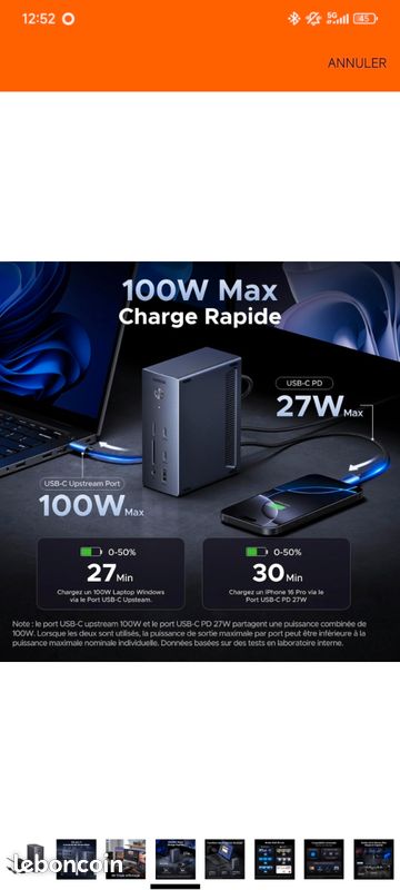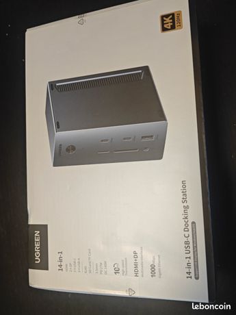 [ Fonctions Supplémentaires ] La station d'accueil pour pc portable est équipée d'un port Ethernet RJ45 1000Mbps, d'un port USB-C PD100W upstream (pour Hôte), d'un port USB-C PD 27W downstream (pour périphérique) et d'un port 3., 5mm de sortie audio ou d'entrée micro, répondant à vos besoins de connectivité pour la mise en réseau, le chargement, l'audio, etc. Station D'accueil USB-C Triple écran UGREEN Revodok Pro Docking Station USB C 2 DisplayPort 4K Dock Usb-c Pour Pc Portable 100w Pd Ethernet Gigabit Sd Tf Le port USB-C avant sert uniquement au transfert de données et ne supporte pas la sortie vidéo ni le chargement. UGREEN Revodok Pro USB C Hub for Laptop 8 in 1 MacBook Docking Station 4K 60Hz HDMI, 100W PD Charging, USB-C & USB-A 10Gbps Data Ports, SD/TF Card Reader for MacBook [ 14 en 1 Extension ] Cette docking station USB C vous offre 2*DisplayPort 4K 120Hz, 1*HDMI 4K@60Hz, 2*USB-C 10Gbps, 1* USB-A 10Gbps, 2*USB-A 5Gbps, 1*Ethernet Gigabit, 1*USB-C PD Out 27W, lecteur de carte SD/TF, 1*audio 3., 5mm et 1*DC IN 24V/5., 83A 140W. Note : veuillez confirmer que le port USB C de votre ordinateur est à fonction complète(DP Alt Mode/PD Charge/Data Transfert). UGREEN Revodok USB C Hub 2*USB A & 2*USB C Ports, 4K 60Hz HDI, PD 100W... 1 100W Max 2 Transfert Rapide 3 Lecteur de Carte & RJ45 4 Taille Spécifique 5 Dissipation Thermique Le port USB-C PD arrière sert uniquement au chargement et ne supporte pas la sortie vidéo ni le transfert de données. [ Triple Affichage ] Avec 2 DisplayPort 4K@120Hz et 1 HDMI 4K@60Hz, ce dock USB C vous permet de connecter 3 écrans externes pour faire du multitâche sans effort. Note : les ports de charge USB-C ne supportent pas les transferts de données et la sortie du signal vidéo., [ Petits Conseils ] 1., Nous vous déconseillons de connecter le téléphone mobile ou la tablette pour l'utilisation., 2., Veuillez confirmer que le port USB C de votre ordinateur supporte le DP Alt Mode pour faire fonctionner les portsDP et le port HDMI., 3., Les ordinateurs macOS supportent uniquement le mode SST, tandis que Windows prend en charge le mode MST., 4., Avant utilisation, veuillez connecter l'adaptateur secteur fourni pour alimenter le dock. Triple Affichage: 2*4K@60Hz+1*4K@30Hz Note : les data ports ne supportent pas la sortie du signal vidéo et la charge.