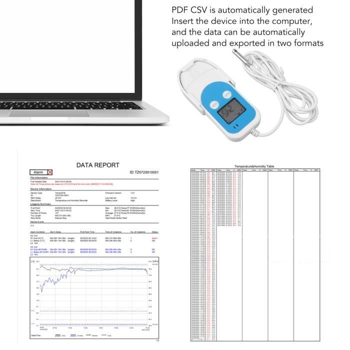 Enregistreur de température de l'air USB LOG200 Qiilu enregistreur de données USB Enregistreur de données de... Enregistreur De Temperature Usb DollaTek Enregistreur De Données De Température Et D'humidité Enregistreur Réutilisable Plage -40°C +85°C Description du produit:Une fois l'appareil branché sur l'ordinateur,les données seront automatiquement téléchargées,le rapport pourra être exporté en deux formats,PDF et CSV seront automatiquement générés. Le stockage de données de grande capacité et l'intervalle d'enregistrement peuvent être configurés par les utilisateurs (10 secondes à 99 heures). Cet enregistreur DollaTek est génial pour surveiller la température et l'humidité ! Branché en USB, il génère auto des rapports PDF/CSV – pratique pour les... Application : convient pour une utilisation dans le stockage et la logistique de la chaîne du froid,tels que les conteneurs réfrigérés,les camions réfrigérés,les boîtes de distribution réfrigérées et les laboratoires d'entreposage frigorifique. L'enregistreur de température numérique génère automatiquement des rapports CSV et PDF contenant une multitude d'informations qui peuvent aider à évaluer les marchandises surveillées. Largement utilisé dans la logistique de stockage et de la chaîne du froid,tels que les conteneurs réfrigérés,les camions réfrigérés,les boîtes de distribution réfrigérées et les laboratoires d'entreposage frigorifique. Logiciel de gestion de données facile à configurer,intervalle de temps d'enregistrement,délai de démarrage,mode d'arrêt,format de l'heure,mode de démarrage,démarrage par synchronisation.