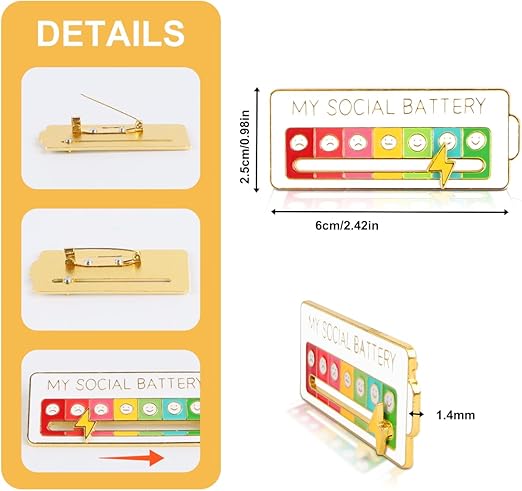 Si vous avez un ami introverti près de vous, il/elle sera très heureux de ce cadeau. Accessoire Introverti Drôle 2 Stück Soziale Batterie Pin, Doppelte Schnalle My Social Batterie Pin Mein Sozialer Batterie Batterie Sociale Vous pouvez facilement ajuster le curseur pour exprimer votre humeur. Couleurs noires et blanches : la broche à piles sociales dispose de deux couleurs différentes de broche à piles sociales, l'une est principalement noire et l'autre est blanche, vous pouvez librement assortir les vêtements de la journée, absolument polyvalente Polyvalent et élégant : ces épingles amusantes sont parfaites pour être assorties avec des sacs à dos, des vêtements ou des bijoux. Simples et classiques, elles complètent n'importe quelle tenue et montrent votre attitude positive. Exprimez vos émotions quotidiennes avec ces épingles d'émail tendance, avec une conception de tracker d'humeur de batterie sociale, parfaite comme broches pour... Matériau de qualité supérieure : cette broche mignonne et amusante est fabriquée en alliage de haute qualité avec une texture émaillée lisse et est durable. Convient aux vêtements, sacs et chapeaux. Cadeau créatif : exprimez votre humeur sans mots. Ma batterie sociale est en déclin - Folie Urbaine Il est très polyvalent et vous aide à attirer l'attention des gens. Un excellent cadeau pour un introverti !