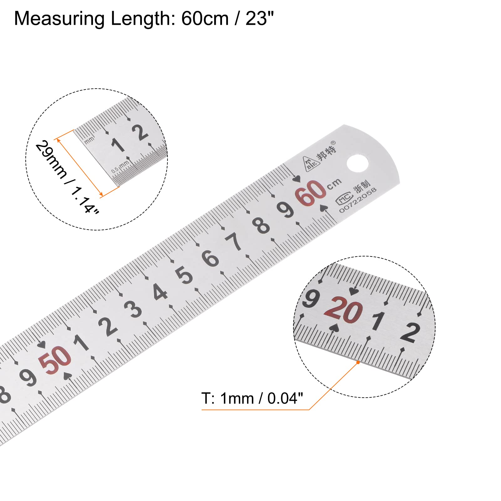 Outil Mesure Précision 1 Mm SUPERTOOL Règle En Acier Inoxydable, 12 Cm, Laiton Pur, Doré, Mesure Précise, Marque-page Pour L'école, Le Bureau, L'atelier Et La Maison (1 Pièce Règle Métal Règle en acier 600 mm 60 cm 24 pouces + règle en acier 500 mm 50 cm 20 pouces, règle en acier avec échelles de mesure en pouces et cm, règle en Règle en acier robuste et précise, adaptée aux domaines professionnels tels que le bâtiment, la mécanique, la menuiserie et d'autres activités nécessitant des... Parfait pour les projets scolaires, les dessins techniques, les travaux manuels, le papier ou les tâches de mesure générales, un ajout essentiel à tout ensemble de papeterie ou trousse à outils. Matériau en acier inoxydable pour une utilisation durable. Marquages clairs et précis : dispose d'échelles métriques et impériales gravées au laser avec une finition peinte pour une meilleure lisibilité. Que vous soyez un étudiant, un enseignant, un artiste, un designer, un architecte, un ingénieur ou un amateur de bricolage, cette règle est un outil fiable pour dessiner des lignes droites, des mesures précises et des travaux de mise en page de précision. Design lisse : conçu avec des bords lisses pour garantir une manipulation sûre. Une extrémité est carrée pour un alignement précis, tandis que l'extrémité arrondie comprend un trou de suspension, idéal pour un accès rapide et un rangement bien rangé dans votre boîte à outils ou votre espace de travail. Large application : idéal pour une large gamme de paramètres, y compris les salles de classe, les bureaux, les ateliers et l'utilisation domestique. Règle métal découpé isolé sur fond blanc acier inoxydable mètre trente...