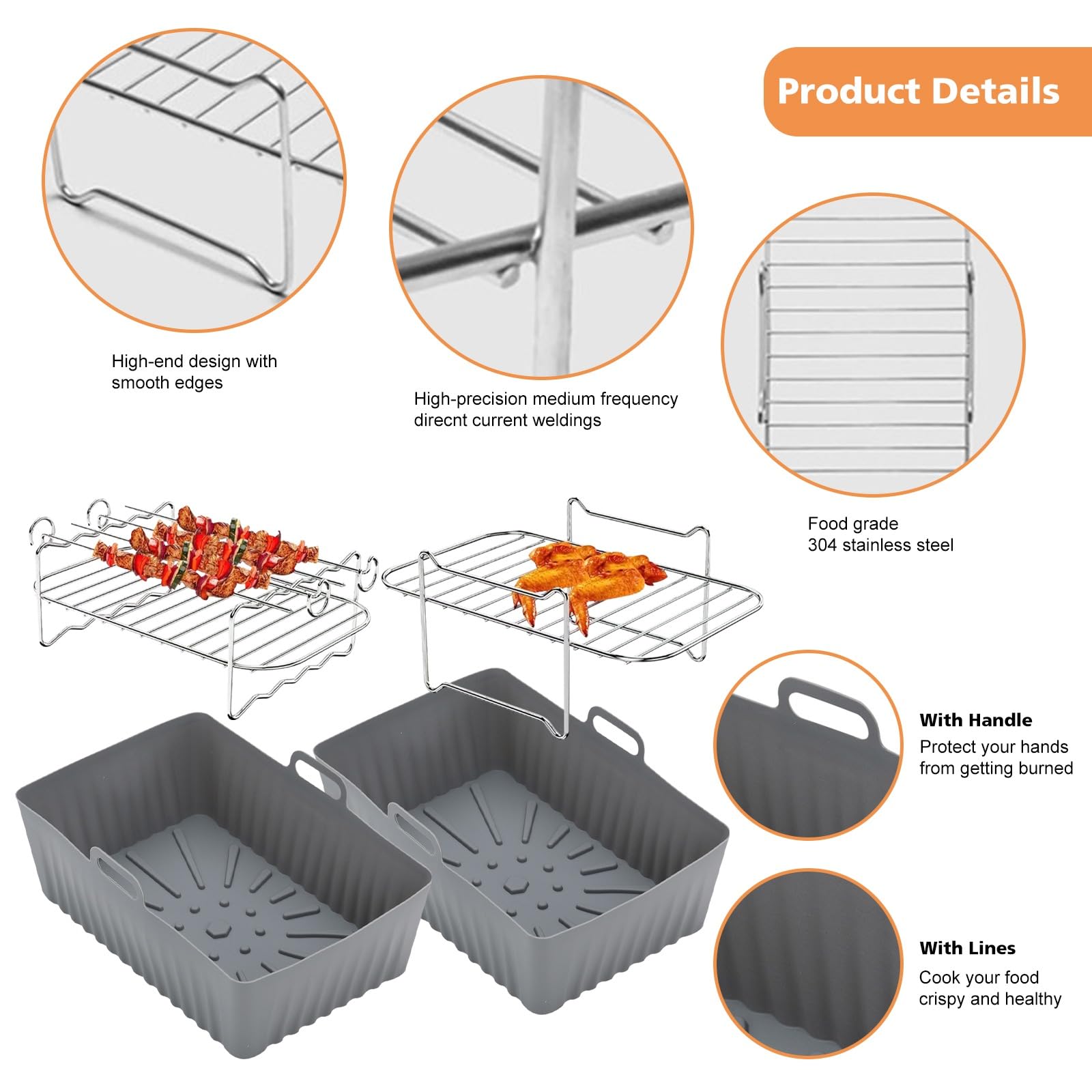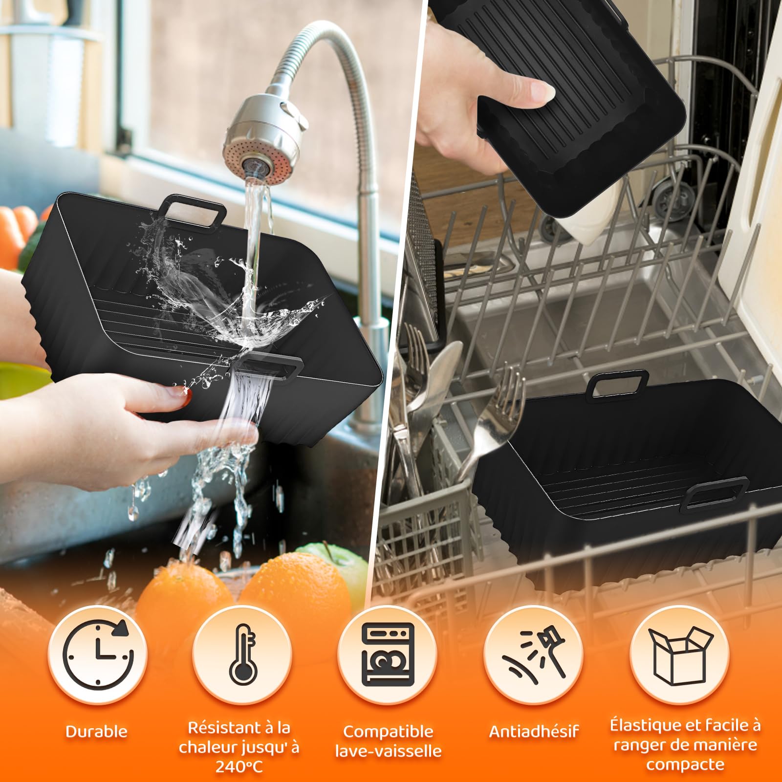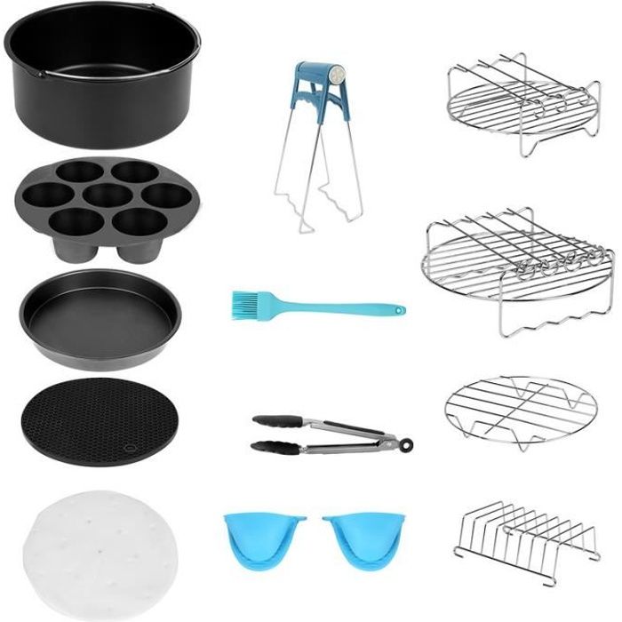 Matériau : silicone de qualité alimentaire. Uenn 6pcs Accessoires de Friteuse à Air, pour Ninja Foodi AF300EU... Répondez à vos besoins, économisez votre temps et commencez une vie de cuisine plus écologique et plus saine! Meilleure circulation de l'air Il est conçu avec des dizaines de lignes en silicone souple sur le fond, aidant à mieux faire circuler l'air et à répartir la chaleur uniformément. Moule Air Fryer 7Pcs Accessoires Air Fryer Ninja 7,6-9,5L, Double Zone/Double Stack Friteuse Sans Huile Accessoires, Moule Silicone Accessoire De Friteuse à Air Chaud Accessoires Pour Ninja AF400EU, AF300EU, AF500EU Accessoire Air Fryer 【Conçu pour la friteuse Ninja Dual Air】Grande taille : 21,5 x 14,5 x 7 cm/8,46 * 5,7 * 2,75. Convient à divers appareils - accessoire de friteuse à air multifonctionnel Compatible avec friteuse à air, micro-ondes, four, congélateur et lave-vaisselle. Liste de colisage: 2 x pot en silicone pour friteuse à air 1x grill+1x grille vapeur+2x gaine silicone+1x brosse silicone+1x clip inox Les inserts de la friteuse à air chaud sont fabriqués en silicone de qualité alimentaire, réutilisable et respectueux de l'environnement. 【Excellente protection】 Notre panier en silicone pour friteuse à air chaud est équipé de poignées creuses des deux côtés qui peuvent être facilement retirées. Conception de vidange d'huile facile Les rainures dans le fond permettent à l'huile des aliments de s'écouler facilement vers le bord du plateau, évitant ainsi que les aliments ne soient trempés. Poignée évidée Il est conçu avec des poignées évidées des deux côtés afin que vous puissiez soulever le pot avec des gants plus facilement. Utilisez des accessoires spéciaux comme ceux pour Moulinex Dual Easy Fry XXL ou le Ninja Air Fryer 10,4L qui s'adaptent parfaitement à vos besoins. Ces ensembles garantissent des repas sains et croustillants, vous permettant de savourer chaque bouchée Peut également être un bol de fruits. 【Facile à Nettoyer】 le revêtement en silicone vous fera non seulement gagner du temps et empêchera la graisse et les résidus tenaces de s'accumuler sur les friteuses et les fours à micro - ondes, mais il prolongera également la durée de vie de vos friteuses. FOLAYA Accessoires Pour Air Fryer-18 Pièces Ensemble D'Accessoires Pour