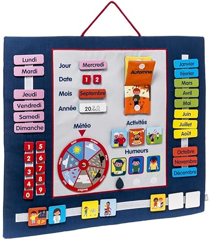Calendrier Semaine Enfant Lilliputiens - Calendrier Tissu Au Fil Du Temps, Livraison Gratuite 24/48h Lilliputiens Bébé Calendrier Tissu Au Fil du Temps Lilliputiens – Éducatif Le panneau calendrier Au fil du temps permet aux plus petits de visualiser et d'apprendre les notions du temps, des saisons et du climat. Les vignettes à... Conçu pour les enfants dès 3 ans, ce panneau d’activités permet de structurer les journées tout en apprenant le temps qui passe en allemand. Grâce aux vignettes à scratch, votre enfant peut changer la date, la météo ou l’humeur du jour de manière interactive. Les illustrations colorées et amusantes en allemand rendent l’apprentissage du temps joyeux et stimulant, tout en ajoutant une touche décorative à la chambre. Offrez à votre enfant une initiation ludique à l’allemand avec ce calendrier en tissu Lilliputiens. Illustrations éducatives et colorées : Avec ses dessins joyeux et ses couleurs vives, ce calendrier en allemand rend l’apprentissage du temps et de la langue encore plus amusant ! La marque des petits plus : Conçu avec soin en Belgique, Lilliputiens crée des jouets innovants, ludiques et rigolo. Choisissez un jouet qui grandit avec votre boutchou et lui offre des moments de jeu mémorables. Le premier calendrier des enfants ! Chaque jour est l'occasion d'apprendre à se repérer dans le temps avec notre calendrier en tissu, pour les petits à partir de 3 ans. C'est le support idéal pour les aider à mieux comprendre la notion de temps qui passe et à identifier leurs émotions