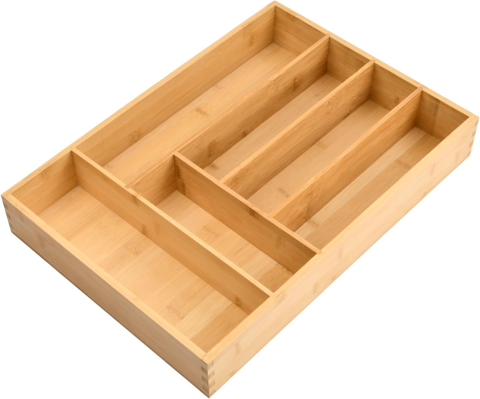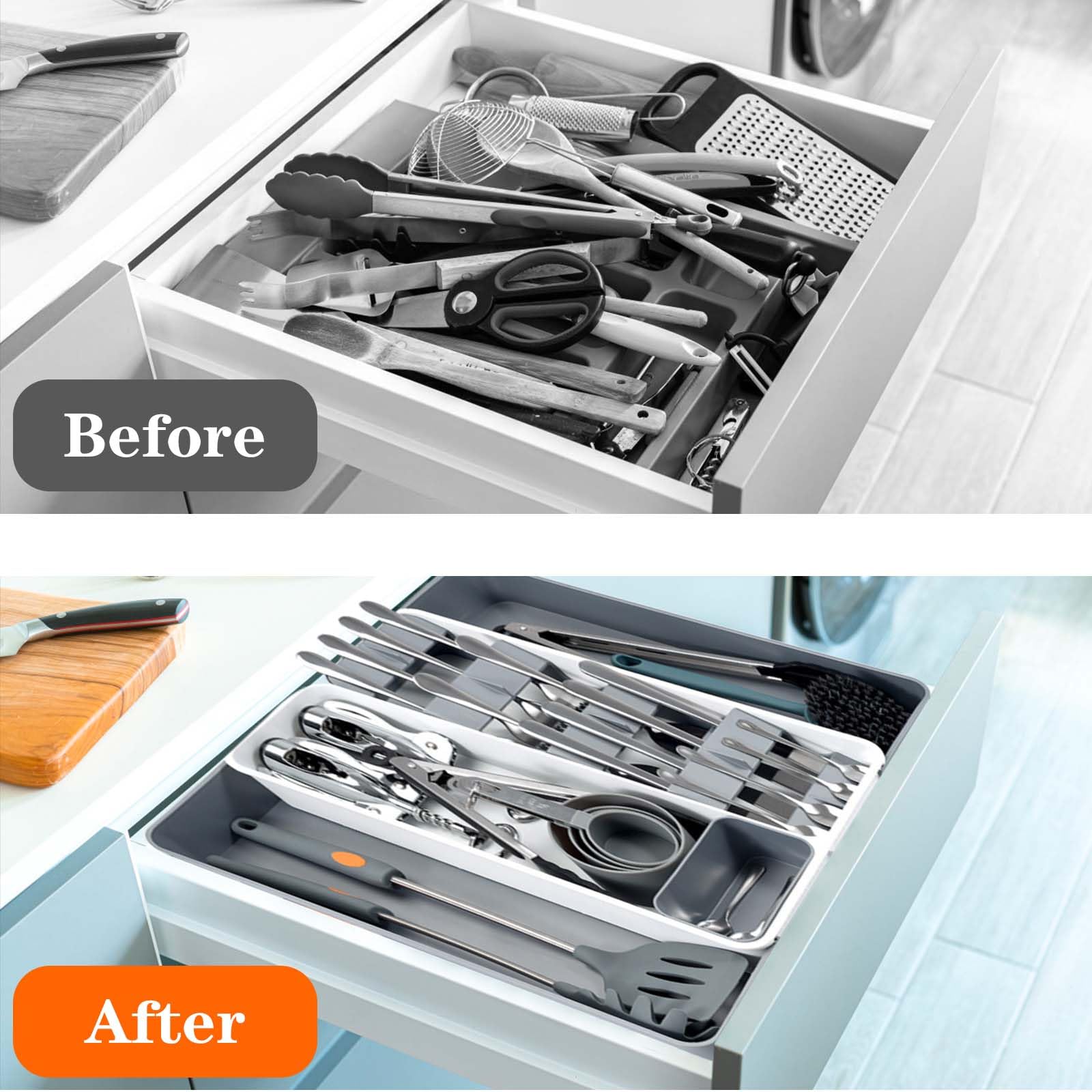 Range-couverts pour tiroir, 5 compartiments organisateur de tiroir, 4,7x32,2x28,4cm, blanc [35 Plus d'espace de rangement : Ce grand range-couverts vous aide à organiser vos tiroirs de cuisine. Ses compartiments extra-profonds offrent un espace de rangement généreux pour vos couverts et ustensiles de cuisine.Dimensions ajustables : Ce range-couverts, conçu pour les tiroirs, est ajustable en longueur (de 33 cm à 55,9 cm) et en largeur (de 36,8 cm à 48,3 cm). Déplié, il mesure 55... Rangement Couverts Fourchettes Cuillères Noir Dyiouxin Plateau D'Ustensiles Extensible Pour Tiroir,8 Tiroir Couverts Extensible Noir Organisateur de tiroir flexible avec longueur réglable pour des tiroirs de différentes tailles. Capacité accrue : Avec 6 compartiments et 2 panneaux latéraux extensibles, ce porte-couverts à tiroir peut accueillir une large gamme de couverts et de couverts, y compris des fourchettes, des cuillères et des couteaux. Un range-couverts est un accessoire de cuisine pratique et indispensable pour organiser vos couverts et ustensiles de manière ordonnée. Que vous ayez une grande... Il est doté d’une plaque de base solide avec des séparateurs robustes qui maintiennent les couverts en place. Les coulissants supplémentaires sont idéaux pour ranger des ustensiles de cuisine plus grands tels que la spatule, les pinces et la louche. De plus, il est facile à nettoyer avec de l’eau ou un chiffon (ne pas laver au lave-vaisselle). Trouvez et saisissez facilement ce dont vous avez besoin sans avoir à creuser.