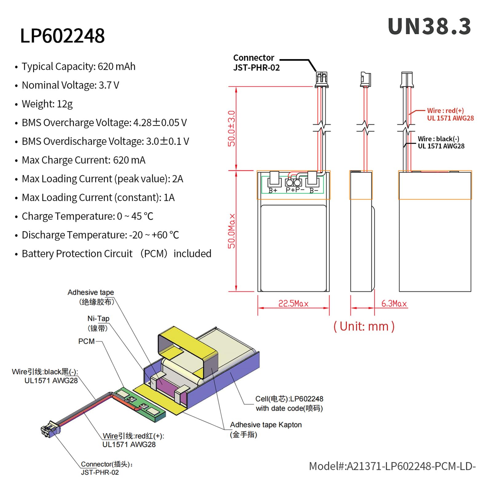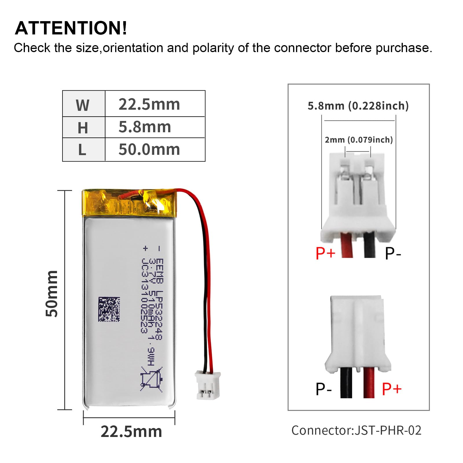 Nous vous répondrons dans les 24 heures. (Cela entraînera une pénurie si la polarité du connecteur de la batterie ne correspond pas à votre appareil., ) Batterie LiPo 3.7V 510mAh EEMB Batterie Lithium Polymère 3,7V 510mAh 532248 Batterie Pile Cr2016 EEB Batterie Lithiu polyère 3,7V 1800Ah 963450 Batterie... INFORMATIONS DE BASE—Tension: 3., 7V; Capacité typique : 510 mAh, capacité minimale : 440 mAh ; Poids : environ 10,2 g ; Taille : 5,8 x 22,5 x 50 mm (LxLxH). La longue histoire d'EEMB a permis à EEMB d'être présent sur tous les principaux marchés mondiaux., LP 772435 batterie rechargeable 3., 7v Capacité nominale et tension: 610 mAh, 3,7 V Méthode de charge Standard: DC / CV (CV courant final 12 ma) Courant de charge Standard: 0,2 C (122 ma) Tension de charge maximale: 4., 200 ± 0., 020 V Courant de décharge Standard: 0,2 C (122 ma) Tension de coupe: 2750 ± 0005 V Courant de charge maximal: 1C (610 ma) Courant de décharge maximal: 2C (1220 ma) Température de gonflage: 0 ~ 45 ℃ / température d'échappement: - 20 ~ + 60 ℃ / température de stockage: - 20 ~ + 25 ℃ Poids: 15 grammes Performances fiables DOIT CONFIRMER AVANT L'ACHAT : 1., Taille de la batterie ; 2., Modèle de connecteur ; 3., Taille du connecteur ; 4., Polarité du connecteur - CE N'EST PAS UNIVERSEL !, !, ! Stockez la batterie dans un endroit frais et sec//Convient pour haut-parleur Bluetooth, caméra de tableau de bord, clavier et souris, systèmes domestiques intelligents compatibles Wi-Fi, PDA et appareils photo numériques, unités de surveillance. PERFORMANCE FIABLE - Pas de fuite, excellente performance économique et longue durée de vie. surcharge, décharge excessive, surintensité, protection contre les courts-circuits, protection contre la surchauffe., Attention! STOCKAGE ET APPLICATION—Conservez les cellules dans un état chargé de 40 % à 60 % pendant le stockage de longue durée. Veuillez vérifier que la polarité de la batterie correspond à votre appareil avant utilisation. EEB Batterie 3.7V 1100Ah 603449 Batterie Lipo 3.7V Rechargeable avec... Fonction de protection PCM : surcharge, décharge excessive, surintensité, protection contre les courts-circuits, protection contre la surchauffe., CERTIFICATIONS—Conforme UN 38., 3., Plus de 400 batteries EEMB sont certifiées UL. Nous vous recommandons de charger la batterie tous les 3 mois après réception de la batterie et de maintenir la tension de 3,7 à 4,0 V. Veuillez vérifier la polarité et la taille de la batterie avant utilisation. EEMB Batterie Lithium polymère 3,7V 2000mAh 103454 Batterie