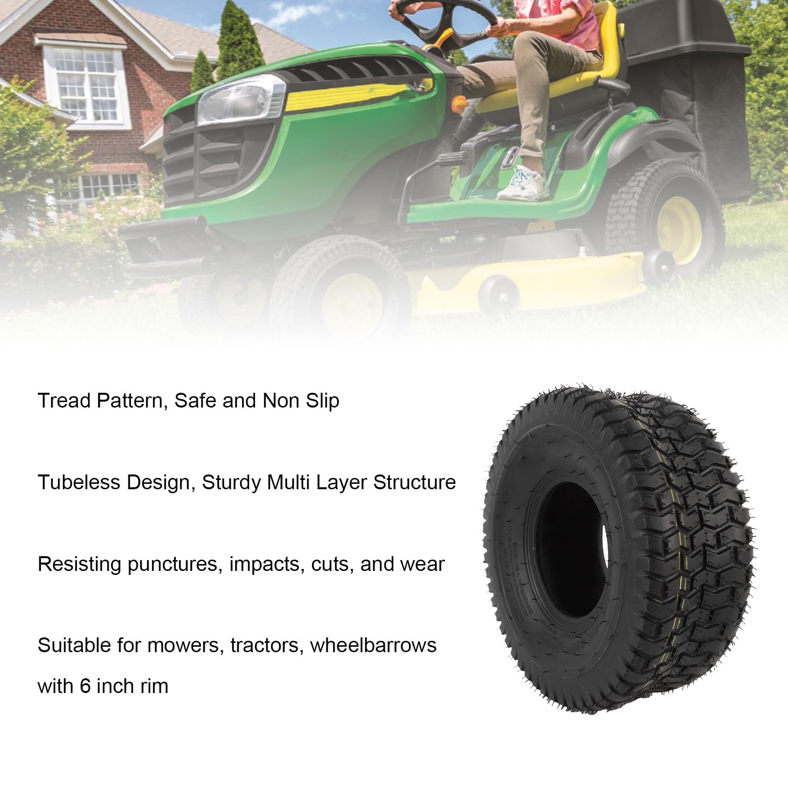 Remplacement Facile ] Remplacez rapidement les pneus usés ou endommagés avec ce pneu sans chambre à vide, adapté aux appareils de conduite, tondeuses, chariots, tracteurs de jardin et brouettes avec jantes de 6 pouces [Technologie de traction avancée] Utilisant la technologie de traction par les épaules, ce pneu à vide offre une adhérence exceptionnelle lors de manœuvres difficiles sur divers terrains. [Composés de caoutchouc] Le pneu sans chambre à vide est fabriqué à partir de composés de caoutchouc, garantissant des performances continues et une longue durée de vie. Pneu Tracteur Tondeuse 15x6 EJ.life Pneu Sans Chambre à Air Sous Vide Pneu Sous Vide 14 Pouces Pour Scooter électrique 14x5 Pneu 15x6.00 6 Tracteur Tondeuse [ Remplacement Facile ] Remplacez rapidement les pneus usés ou endommagés avec ce pneu sans chambre à vide, adapté aux appareils de conduite, tondeuses, chariots, tracteurs de jardin et brouettes avec jantes de 6 pouces. Comparer les offres est la clé pour faire un choix éclairé lors de l'achat de vos pneus 15x6.00-6. Les vendeurs sur proposent des descriptions détaillées de leurs produits, ce qui vous permet de comparer les caractéristiques techniques et les Spec: Type d'article : Pneu à chambre à vide Matériau du produit : Caoutchouc Spécification : 6 pouces, 15x6., 00-6 Application : Convient aux appareils de conduite, tondeuses, chariots, tracteurs de jardin, brouettes et plus encore Liste des colis : 1 x pneu à chambre à vide de 6 pouces Remarque : 1., Avant d'acheter, veuillez vérifier attentivement le modèle de votre pneu d'origine et vous assurer qu'il correspond à notre modèle de pneu., 2., Il est recommandé d'acheter deux pneus en même temps pour éviter une hauteur inégale entre les côtés gauche et droit du véhicule. Pneu de Tondeuse à Gazon, Roue de Pneu 15x6.00‑6 avec Pneus de Moyeu pour Véhicule Agricole de