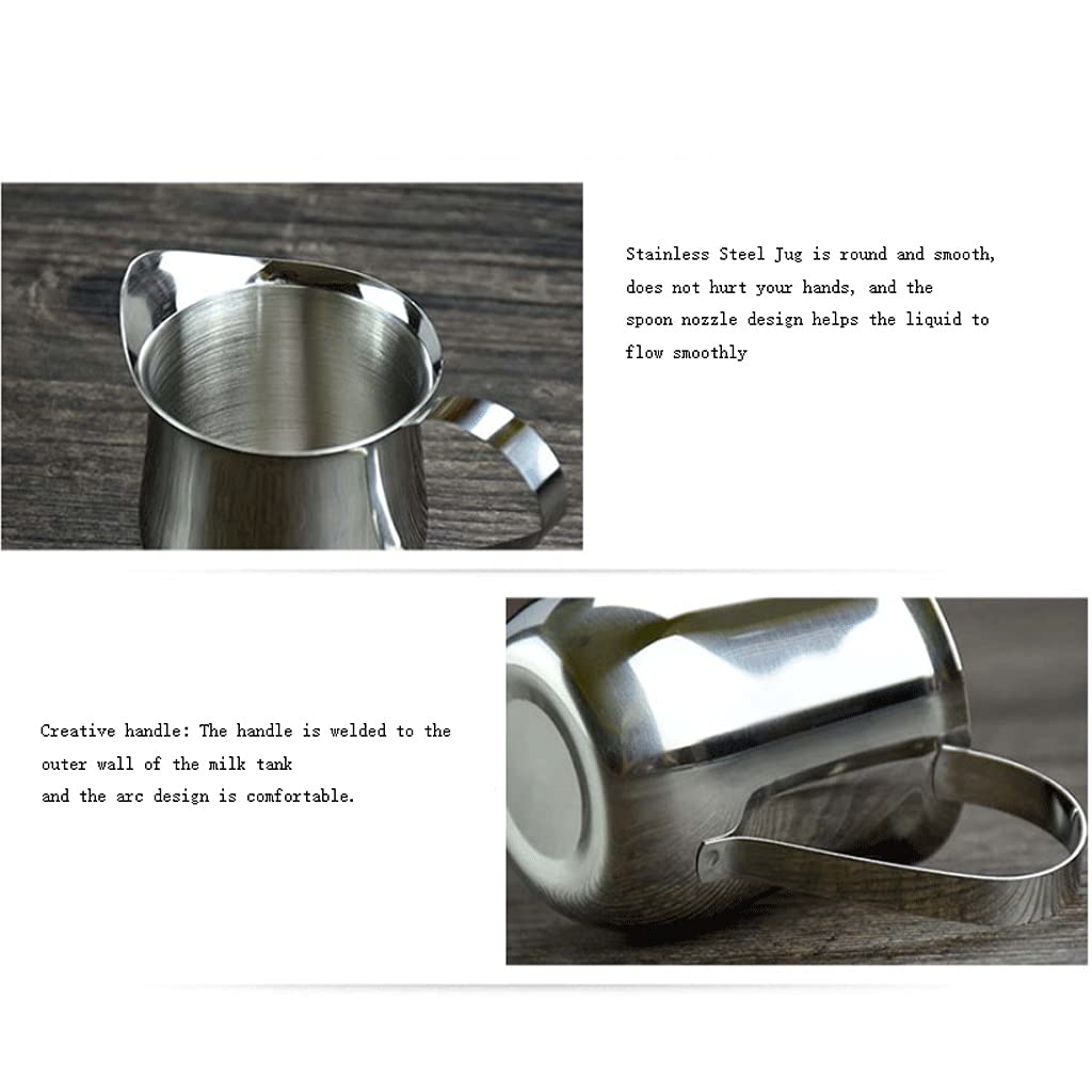 Pichet à mousse de lait sans poignée avec mesure, pour café, cappuccino, expresso, mousseur à la vapeur avec manches en caoutchouc, stylo de décoration, latte art et chiffon en microfibre, 350 ml Le pichet à mousse de lait en acier inoxydable 304 de 350 ml est conçu pour les amateurs de café et de cappuccino. Fabriqué en acier inoxydable de qualité alimentaire, il est résistant à la rouille et à la corrosion, ce qui le rend idéal pour un usage quotidien Meilleur Pichet à Lait 2022 ESTINK Cuque Pichet De Mousse De Lait Pichet à Mousse De Lait Tasse à Meilleur Pichet A Lait 1., Fabrication de mousse de lait : la tasse est principalement utilisée pour faire mousser ou cuire du lait à la vapeur, puis verser la mousse de lait dans la tasse à café, créer un beau motif de mousse., 2., Structure raisonnable : la tasse à mousser le lait est également parfaite pour servir du lait. Bouche verseuse ronde, guide lisse, empêche les fuites de lait, prévenant et fiable à utiliser. Cuque buse à vapeur pour mousse de lait Machine à café buse à vapeur mousseur à lait lavable... Compact et léger, facile à transporter, parfait pour les cafés et les hôtels., 5., Matériau en acier inoxydable : le pichet à mousser le lait est fabriqué en excellent acier inoxydable, procédé de polissage miroir, ferme et robuste, antirouille et stable, stable et durable. Utilisation sûre : fabrication exquise, attention aux détails, surface lisse et coin moelleux, sans bavure, ne rayera pas la peau, peut être utilisé en toute confiance. Matériau en acier inoxydable : le pichet à mousser le lait est fabriqué en excellent acier inoxydable, procédé de polissage miroir, ferme et robuste, antirouille et stable, stable et durable. Multiples endroits applicables : poignée en forme d'oreille, conforme à la conception ergonomique, facile à tenir et à utiliser.