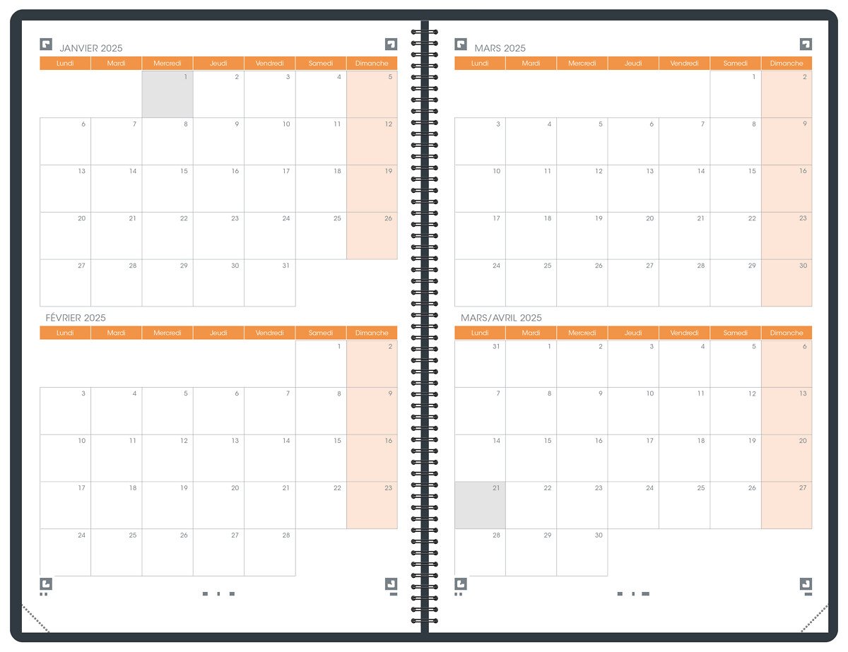 Agenda semainier Horizon 27 - 21x27cm - Noir - Janvier à décembre... Certifications : PEFC (fibres de papier issues de forêts gérées durablement),Imprim'vert (impression respectueuse de l'environnement). Né dans les Vosges, fabriqué en France et pensé pour vous ! Agenda Spiralé 21x27 Cm Recharge EXACOMPTA Pour Agenda 2026 Horizons 27 - 27x21cm Agenda 2026 Semainier Spirale Les + :impression en bleu et gris, sur papier légèrement bleuté Clairefontaine, reconnu pour sa qualité et pour permettre une écriture douce et fluide, tranche naturelle, emplacements rappels ou mémos, coins détachables, pour pouvoir accéder rapidement à la semaine en cours. La recharge de votre agenda est fabriquée en France de façon écologiquement responsable avec un papier issu de forêts gérées durablement. La semaine de 6 jours (lundi-samedi inclus - petit emplacement sans horaire pour le dimanche) sur 2 pages, grille verticale, horaires de 7h à 21h, rdv par 1/2 heure, édition française Spirale plastique, pour une ouverture et une mise à plat facile de l'agenda. Agendas Exacompta pas cher - Achat en Ligne - Welcome Office
