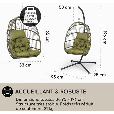 ✅ Il suffit de 10 à 15 minutes pour assembler le fauteuil balançoire à œuf par une seule personne - Le fauteuil balançoire avec support est livré avec des accessoires d'assemblage, vous pouvez simplement suivre le manuel d'instructions ou la vidéo d'installation pour une mise en place facile. ✅ Vous allez adorer le confort et la détente de cette chaise à œufs ! Nous vous assurons 365 jours de garantie à partir de la date d'achat et un service clientèle amical. Toujours assurer un bon assemblage en suivant les instructions fournies (français non garanti). Fauteuil oeuf : 12 idées et modèles pour l'adopter en déco Ce fauteuil œuf en osier est pliable et portable, il peut donc être emmené partout où vous le souhaitez. Cette chaise hamac est conçue pour être utilisée avec un support robuste et peut être utilisée en toute sécurité sur différents terrains. Coussin de chaise rond multifonction à suspendre pour extérieur/intérieur Motif floral 80 x 80 cm Parfait pour balançoire en polyrotin/rotin Idéal pour le... Vous recevrez beaucoup de compliments de leur part. Description du produit LKINBO Chaise suspendue en forme d'œuf pour l'extérieur et l'intérieur Chaise suspendue en rotin avec support Balançoire de jardin pliable Chaise en osier avec coussin Capacité de 160 kg, Marron Avertissement De Sûreté Capacité de charge maximale : 195 kg. ✅ Décoration élégante à l'intérieur et à l'extérieur - Cette chaise d'œuf d'intérieur et d'extérieur jouera certainement un bon rôle décoratif à l'intérieur et à l'extérieur, ajoutant un siège élégant à un appartement, parfait pour le salon, le patio, la chambre à coucher, le balcon, l'arrière-cour, le porche, la terrasse, la cour, le jardin, le camping et ainsi de suite. Support Pied Pliable IDMARKET Fauteuil Oeuf Suspendu Ajouré Effet Rotin Avec Coussin écru - Maison Fauteuil Balançoire Pliable Jardin Coussin de chaise suspendu en forme d'œuf - Imperméable - Respirant - Pour l'intérieur et l'extérieur - Parfait pour la terrasse, le jardin et la décoration de la maison Recommandez sans hésiter cette chaise balançoire comme cadeau pour vos amis, vos parents, vos enfants et tous ceux que vous aimez.