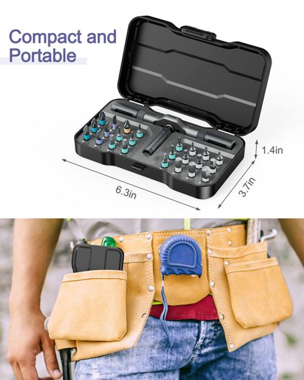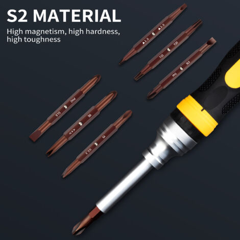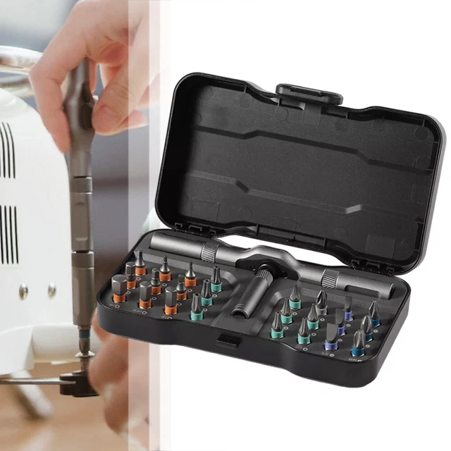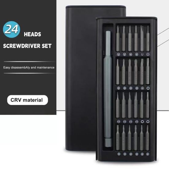 Boite Tournevis Multi Embout JEU DE TOURNEVIS à Cliquet Effort Saving 24 En 1 Pour Diverses Applications EUR 33,46 - FR Embouts Pour Réparation électronique Tournevis DIY 24 en 1,ensemble de tournevis 24 en 1, kit de précision d Description de Set de Tournevis Magnétique 24-en-1 avec Poignée à Cliquet - Amélioration 2025 DIY Mini Set de Précision, pour Meuble, Ordinateur, Vélo KIT POLYVALENT : Ce jeu de tournevis 24 en 1 comprend de nombreux embouts de précision adaptés au montage de meubles, à la réparation d'ordinateurs et à l'entretien de vélos Jeu 24-en-1 polyvalent:Inclut 5 types de pointes magnétiques (PH/SL/Torx/Hex/PZ) pour réparations domestiques, électroniques et industrielles. Adapté à 99% des vis courantes. Mécanisme à cliquet efficace:Le cliquet 58 dents réduit l'effort de serrage de 80%. Spécifications : Traitement de surface de la lame : Gris phosphate Matériau de la lame : Acier allié S2 Matériau du bras : Acier allié S2 Matériau du manche : Acier inoxydable + aluminium Fonctions : Convient pour l’électronique, la réparation d’appareils électroménagers, l’entretien de vélos et le démontage de vis de forme spéciale Conception du cliquet : 58 dents, rotation de 6,2° Contenu : Tournevis 24 en 1 pour bricoleurs Utilisation prolongée sans ampoules même avec les mains moites. Organisation magnétique intelligente:La boîte trie les embouts par code couleur. Glisse dans un sac à outils ou une poche de travail. 24 embouts de tournevis en acier allié chrome-molybdène S2 de qualité industrielle subissent un traitement thermique continu. Moulés CNC et carbonisés de haute précision pour une durabilité de qualité industrielle, ces embouts sont incassables et résistants.Ce coffret de tournevis 24 en 1 comprend cinq types d'embouts différents pour répondre à divers besoins, notamment pour un...