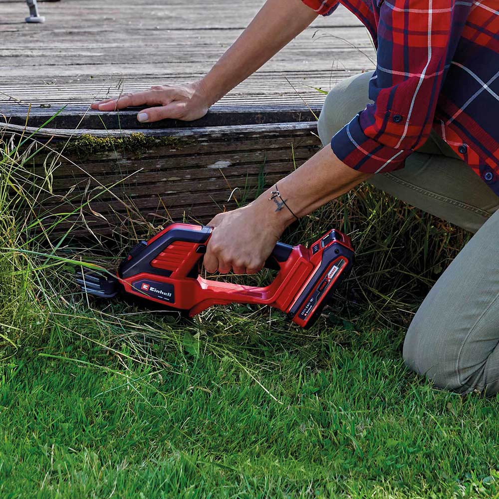 Changement d’accessoire – Le changement d’accessoire s’effectue facilement et sans outil par pression sur un bouton. Le changement d’accessoire s’effectue très facilement et sans outil. Kit Outil Jardin Power X-Change Einhell Cisaille à Gazon Taille-buissons Sans Fil GE-CG 18/100 Li T-Solo Power X-Change (18 V, Changement D'Accessoire Sans Outil, Vendue Avec Rallonge Télescopique) Avec Chargeur Et Batterie 2,5Ah Cisaille Gazon Sans Fil Einhell 18V Il est en outre plus léger, plus silencieux et d’une utilisation plus flexible que les modèles thermiques ou électriques, et constitue ainsi l’outil idéal pour tailler, sculpter et élaguer arbustes et buissons. Cisaille à gazon Einhell GE-GC 18/100 Li T en Promotion Einhell Cisaille à gazon, taille-buissons sans fil GE-CG 18/100 Li T... taille-buissons – Avec une largeur et une épaisseur de coupe de 200 mm et 8 mm, l’acc. La surface souple Softgrip assure ergonomie et prise en main parfaite à chaque mouvement. taille-buissons à lames découpées au laser et affûtées au diamant, permet un élagage précis des haies. Cet appareil sans fil est une alternative confortable aux opérations manuelles de coupe et d’élagage dans le jardin. Accessoire coupe-herbe – La cisaille à gazon taille-buissons est vendue avec un accessoire coupe-herbe tranchant d’une largeur de 100 mm pour l’entretien optimal des bordures de gazon., Acc. La cisaille à gazon taille-buissons sans fil GE-CG 18/100 Li T (1 x 2,5 Ah) Einhell est un outil puissant de la gamme intelligente Power X-Change.