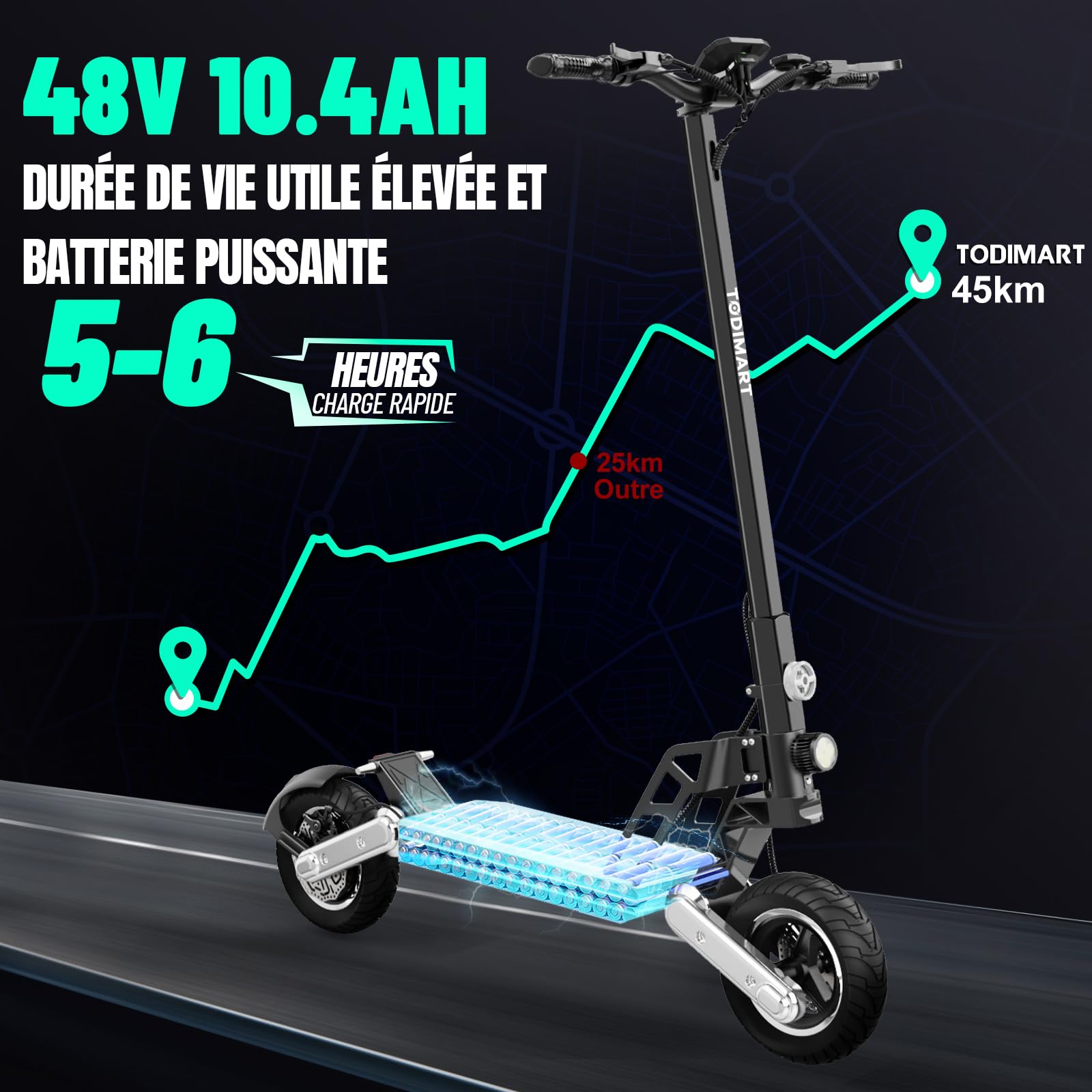Vous pouvez contacter les vendeurs via Amazon pour trouver une solution. Trottinette Adulte Puissance 2000W TODIART T3 Trottinette Electrique Adulte Ultra Legere, Autonoie 30k Trotinette Électrique Trotinette Electrique Adulte 50km Le trotinettes électriques X5S est équipé de phares, de feux de freinage et de clignotants qui peuvent être actionnés à partir de la poignée afin d'assurer votre sécurité sur la route. Pliable, facile à transporter, peut être plié en seulement 2 étapes et 3 secondes. 🎁【Grand tableau de bord et clignotants】Le trotinette électrique est équipé d'un tableau de bord LCD clair et magnifique sur la poignée, qui vous permet de voir clairement les informations de base telles que le niveau actuel de la batterie, le mode de vitesse, la vitesse instantanée, les feux allumés, etc. La sculpture de la bande de roulement est spécialement conçue pour offrir une excellente adhérence même sur routes mouillées. Trottinette électrique pas cher Les deux systèmes travaillent ensemble pour améliorer l’efficacité du freinage et offrir 🎁【Trottinette electrique adulte puissante】Le trottinette electrique adulte X5S de TODIMART est équipé d'un moteur haute puissance de 1000W*2, d'une vitesse plus rapide, Capacité d'escalade jusqu'à 35°. La politique d'après-vente est comment? Toutes les trottinettes électriques de la marque TODIMART offrent gratuitement des pièces détachées, des réparations, des échanges et des retours. Le X5S rend votre conduite plus fluide et vos déplacements plus agréables. Ses excellentes propriétés d'amorti réduisent les vibrations et vous assurent un confort de conduite. Mon avis sur ce produit La TODIMART Trottinette Électrique Adulte G2 séduit par son design très joli et son confort exceptionnel, grâce à ses bons amortisseurs et sa double suspension, qui procurent une conduite agréable même sur terrains difficiles. Son moteur de 500W assure une accélération fluide et efficace, tandis que son autonomie est suffisante pour les trajets quotidiens. J... La TODIMART Trottinette Électrique Adulte Puissante G2/S9 se distingue par ses performances impressionnantes. Équipée d'un moteur de 500W, elle offre une vitesse maximale qui garantit des trajets rapides et efficaces. Pour ceux qui recherchent encore plus de dynamisme, les versions 1000W et 2000W sont également disponibles Quel est le matériau du corps du trottinette électrique X5S ? Le corps du X5 et du X5S est fabriqué en alliage de magnésium renforcé, qui est non seulement léger mais aussi très solide. Le trottinette électrique de la série X peut être connecté à l’application mobile, peut-il donc être antivol ? La série X dispose d’une fonction de verrouillage à un bouton, en partant, ouvrez l’application mobile pour la verrouiller d’un seul clic, empêchant efficacement le vol et disant complètement adieu à l’inquiétude de perdre le scooter électrique. Adoptez un cadre en alliage de magnésium, léger. Quelle est la vitesse maximale de la trottinette électrique TODIMART X5S ? Appuyez et maintenez le frein sans le relâcher, puis appuyez trois fois sur le bouton d’alimentation pour supprimer la limite de vitesse en un clic, et la vitesse maximale peut atteindre 50 km/h