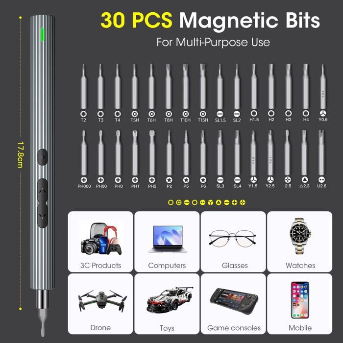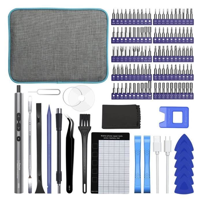 MQUPIN Mini tronçonneuse électrique portable de 15,2 cm avec dispositif Que vous soyez un réparateur professionnel ou un enthousiaste de réparation à domicile, le mini tournevis électrique peut répondre à vos besoins de démontage, de réparation et de remontage Tournevis Sans Fil écran LED Tournevis électrique 78 En 1, Mini Tournevis électrique Avec 70 Embouts, Kits De Précision Rechargeables, Petits Ensembles Pour L'électronique, Vert Kit Tournevis 78 En 1 électronique Le couple manuel de 7 N·m assure un assemblage rapide sans endommager les appareils de précision, tout en protégeant vos poignets et en offrant un couple précis pour vos travaux manuels 【Conception magnétique intelligente】 : Le tournevis électrique sans fil possède un boîtier magnétique qui maintient l'outil et les 56 embouts bien organisés. Ce kit de tournevis électrique mini ofe une précision maximale avec 68 outils de réparation puissants, dont 64 clés Torx Phillips. Idéal pour les travaux de... Avec 56 embouts, incluant Phillips, Torx, à plat, Tri-Wing, hexagonaux, pentagonaux et triangulaires, ce tournevis de précision électrique répond à tous vos besoins de réparation Le mandrin et les embouts sont magnétisés pour une fixation facile des vis pour des tâches de démontage, remplacement et maintenance 【Batterie longue durée】 : Ce tournevis électrique sans fil intègre une batterie rechargeable de 350 mAh.
