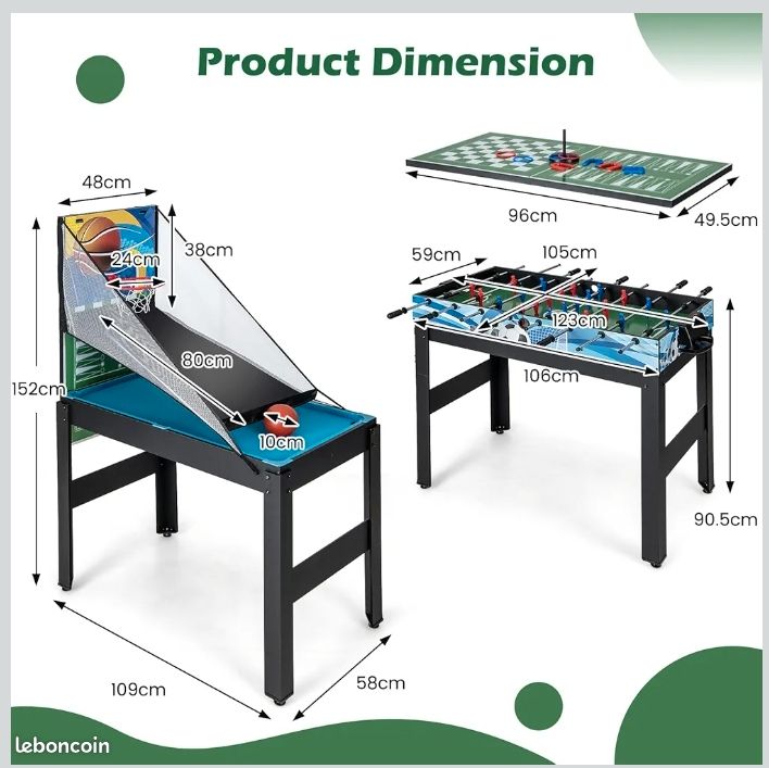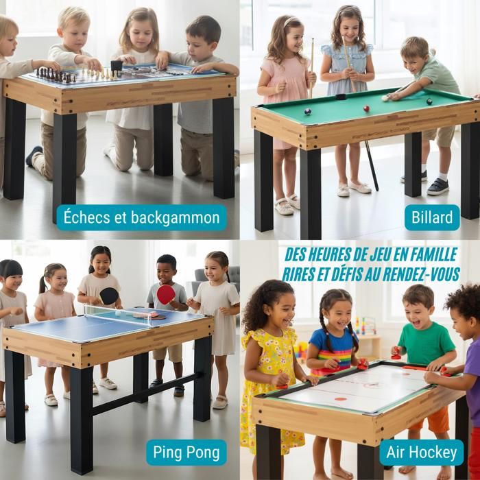 Cette table multijeux convient aux enfants de 6 ans et plus, adaptée à toute la famille CONSTRUCTION ROBUSTE : Construite en MDF de haute qualité avec une finition impeccable, cette table de jeux polyvalente garantit une surface de jeu stable pour des parties endiablées en famille. AMUSEMENT FAMILIAL : Idéale pour les adultes et les enfants dès six ans, cette table multijeux diversifiés fait de chaque soirée un moment inoubliable de jeux en famille, favorisant le rire, la compétition amicale et le partage. Cette table de jeux multifonction est fabriquée à partir de panneaux MDF, garantissant une stabilité de jeu Table multijeux 13 en 1 pliable, table de jeu baby-foot Le design compact est idéal pour les petits espaces , Montage nécessaire La table multi-jeux SPORTNOW résout ce problème en proposant 13 jeux en une seule unité. Spécifications. Couleur : multicolore. Matériau : MDF, métal, plastique. Dimension du baby-foot : 105 x 106 x 90,5 cm (L x l x H). Dimension de la table de... Tranche d'âge conseillée : à partir de 6 ans., Assemblage requis. Fatigué des salles de jeu encombrées et des tracas liés à l'organisation de différentes activités ? Le plaisir s'envole lorsque les tables fragiles sont dangereuses ou que les changements de jeu prennent trop de temps. DIVERTISSEMENT COMPLET : Accompagnée de tous les accessoires nécessaires pour lancer immédiatement une partie parmi les 13 jeux proposés, tels que le billard et le tennis de table, cette table de jeux multifonction promet des moments excitants dès son installation. Table Jeu Enfant Adulte SPORTNOW 13 En 1 Pliable, Table De Jeu Baby-Foot Table Multijeux Découvrez notre gamme de tables baby-foot multi-jeux au meilleur prix ✓ Livraison gratuite à partir de 29,99€ ✓ Paiement 3X CB ✓ Echanges et retours INFORMATIONS DE LA TABLE DE JEU : Dimensions totales : 121L x 109l x 80H cm (avec manettes et rangements).
