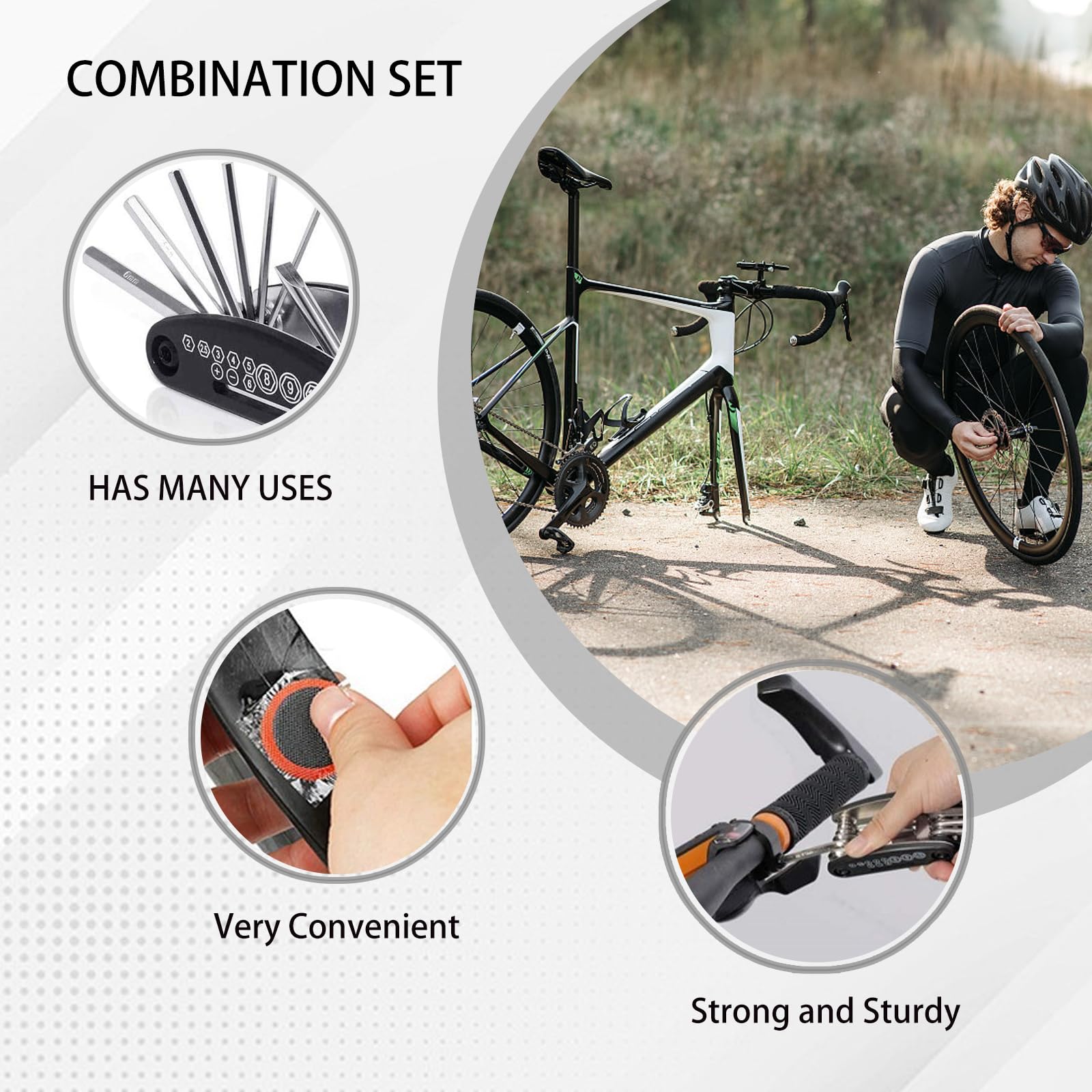 Matériaux : métal et ABS., Couleur : noir. Tbest Aiguille de râpe Kit de Réparation de Pneus Bouchon de Crevaison 【Ensemble d'outils de vélo super utile】Ensemble d'outils de vélo 16 en 1 fabriqué en acier de haute qualité, léger et compact, plus durable. Rustine Velo JQUAL Kit D'outils De Réparation Multifonction 16 En 1 Pour Vélo De Vélo, Kit De Réparation De Crevaison, Accessoires De Vélo De Montagne, Cadeaux De Cyclisme Outil Multifonction Vélo 16 En 1 Caractéristiques : Nom du produit : outil de réparation multifonction pour vélo. 16 en 1 : Clé Allen (2 / 2,5 / 3 / 4 / 5 / 6 mm). Emballage Complet : Outils Multifonctionnels pour Vélo 16 en 1, Kit de Réparation de Crevaisons (3 leviers pour pneus / 2 tiges pour pneus avec levier en... Grâce à lui, vous n'avez pas à vous soucier des problèmes de petits objets qui se perdent souvent. Réparation de vélo 16 fonctions tout en un : clé hexagonale 8/9/10 mm, tournevis plat, tournevis cruciforme, tige de rallonge, clé solide 8/10/15/mm, clé à rayon/14G, clé hexagonale intérieure 2/2,5/3/4/5/6 mm. Avec les multi-outils vélo, vous disposez ainsi de toutes les clés, de toutes les tailles, afin de réparer les pièces défectueuses. Que ce soit sur une route ou sur un sentier de terre, c’est un équipement essentiel pour faire face à toutes les situations Le forfait comprend: 1 kit d'outils de réparation de vélo 16 en 1., 2 démonte-pneus., 6 rustines pour pneus., 1 clé., 1 lime en métal., 1 sac de rangement. Clé à douille (tige épaisse de 8 mm, 9 mm, 10 mm)., Tournevis (tournevis - / +). 【Bon matériau】Le kit d'outils de réparation multifonction pour vélo est fabriqué en acier au carbone de haute qualité et en matériaux ABS, et a été traité thermiquement. Convient pour les vélos, les VTT, les vélos de route, les vélos pliables, les vélos pour enfants, les vélos ordinaires ou les vélos stationnaires, notre kit d'outils multifonction 16 en 1 peut vous aider à résoudre facilement le problème. Pochette à outils portable dédiée : tous les outils et accessoires peuvent être placés à l'intérieur, y compris tous les accessoires et autres petits articles.