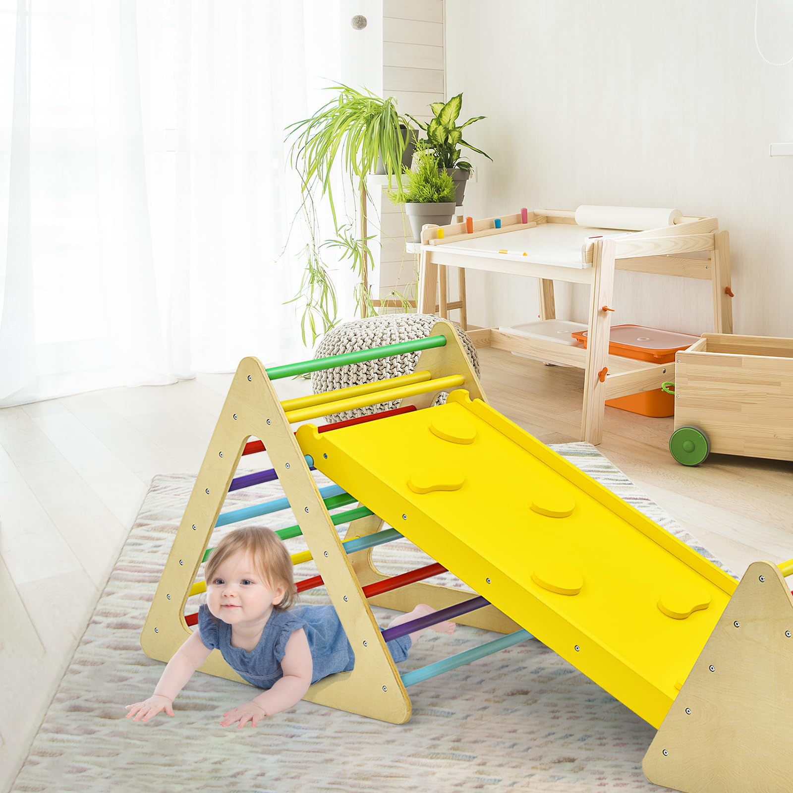 Jouets éducatifs pour améliorer les capacités motrices et sociales Les parents peuvent être sûrs qu'il s'agit du bon choix pour la croissance et la réussite de leur enfant Spécifications : Couleur : naturel / multicolore Matériau : bois de hêtre, contreplaqué, ficelle de coton Dimensions du produit : 105 x 67 x 112 cm (L x L x H x P) Poids net : 17 kg Poids brut : 19 kg Pièces : 1 x Triangle d'escalade avec toboggan pour enfants. Jouet éducatif 1 An Et Plus Triangle Pikler 5 En 1 Triangle Escalade Enfant FANTASK 5 En 1 - Grimpeur Bois Avec Rampe Réversible 3 Ans Et Plus Jeu Montessori Filet Escalade Enfant DESIGN INNOVANT TOBOGGAN : Le design unique du toboggan, dont l'inclinaison est réglable et qui est équipé d'une main courante, rend les enfants plus sûrs lorsqu'ils glissent. SÉCURITÉ ET FIABILITÉ : les coins arrondis et la surface sans échardes réduisent considérablement le risque de blessures pour les enfants, ce qui permet aux parents d'avoir l'esprit tranquille. La large base est équipée d'ancrages métalliques au sol, ce qui l'empêche de vaciller et de basculer, offrant ainsi un espace de jeu sûr aux enfants. Avec des zones d'attente, d'accélération et d'arrêt, le toboggan est riche en fonctionnalités et réglable en hauteur pour s'adapter à l'âge et au niveau d'habileté de votre enfant, lui permettant de relever différents défis. COSTWAY 4 en 1 Triangle d'escalade Montessori Enfants 1 an+ avec Construction robuste et durable avec une base large et des ancrages métalliques pour plus de sécurité. CENTRE DE JEU MULTIFONCTIONNEL : ce jouet d'escalade pour enfants combine une barre simple, un toboggan, un filet d'escalade et une échelle, offrant un large éventail d'options de jeu pour que les enfants s'amusent et fassent de l'exercice. Peinture à base d'eau respectueuse de l'environnement. La surface en bois est traitée avec une peinture à base d'eau, respectueuse de l'environnement et inoffensive, et la sécurité est renforcée. Grâce au jeu, les enfants peuvent améliorer leur motricité, leur condition physique et leurs aptitudes sociales par l'interaction, ce qui contribue utilement à leur développement général. Ce kit d'escalade d'inspiration Montessori associe un triangle Pikler réglable, une arche d'escalade polyvalente et une rampe double face, le tout conçu pour encourager le jeu actif, imaginatif et sûr, de la petite enfance à la petite enfance Pikler Triangle 105 cm, aire de jeux avec toboggan, tour d'escalade pour tout-petits et enfants d'âge préscolaire, triangle pikler en bois. Marque: Klimspeel... Un jeu idéal qui allie sécurité, divertissement et éducation pour contribuer au développement global de votre enfant. Coins arrondis sûrs et surfaces sans échardes pour réduire le risque de blessures. Convient aux enfants à partir d'un an, c'est un compagnon idéal pour les aider à grandir. Description du produit Ce cadre d'escalade multifonctionnel pour enfants combine l'exercice, le divertissement et l'éducation pour offrir un espace de jeu sûr aux enfants âgés de 1 an et plus.
