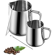 Matériau robuste : pot à lait en acier inoxydable pour une utilisation durable : ce pot à lait est fabriqué en acier inoxydable de qualité supérieure, résistant à la rouille et facile d'entretien. ★ Bec verseur précis pour latte : le bec ergonomique permet un arrosage contrôlé et un design parfait de mousse de lait. Ce pot à lait Barista est un must pour tous les fans de latte art. 1 pot à lait en acier inoxydable de 600 ml. ★ Polyvalent : idéal comme pot à lait Barista pour cappuccino, expresso ou même pour servir de la crème, des sauces ou de la pâte. Manche épais et poli : Confort et contrôle pour verser la création de motifs latte. Capacité 350/600/900ML:Choix de tailles pour verser une précision de mesure et de oissement En tant que pot à lait Barista ou pot à lait Barista, c'est l'accessoire parfait pour une préparation créative du café. Contenu de l'emballage : 1 pot à lait en acier inoxydable de 350 ml. ★ Deux tailles pour plus de flexibilité : le kit comprend un pot à lait de 350 ml et un pot à lait de 600 ml, parfait pour différentes applications. Pot Lait Inox Baristator - Pichet à Lait En Acier Inoxydable 420 Ml Préparation Cappuccino Pot à Lait Inox pour Thé, Café et mousse de lait pour Latte Art | Café... En tant que mousseur à lait, il est idéal pour les motifs fins de type latte ou pour verser uniformément la mousse de lait. Que ce soit comme pot à lait pour cappuccino ou comme mousseur à lait, cet accessoire est un must pour tous les amateurs de café. En tant que pot à lait Barista, il est idéal pour une utilisation quotidienne dans la cuisine ou sur la machine à expresso. Ce mousseur à lait apporte qualité et style à chaque tasse. Théière Lait Cappuccino Pot à Lait Barista LATRAT - 350ml Inox 【Deux tailles pratiques – Pot à lait de 350 ml et 600 ml】Le lot contient deux pots à lait en acier inoxydable de 350 ml et 600 ml – Parfait pour mousser et verser du lait ou de la crème. Caractéristiques techniques : Matériau : acier inoxydable. Tailles : 350 ml et 600 ml Couleur : argenté. Ce pot à lait en acier inoxydable convient non seulement aux professionnels, mais aussi aux amateurs de café à la maison.