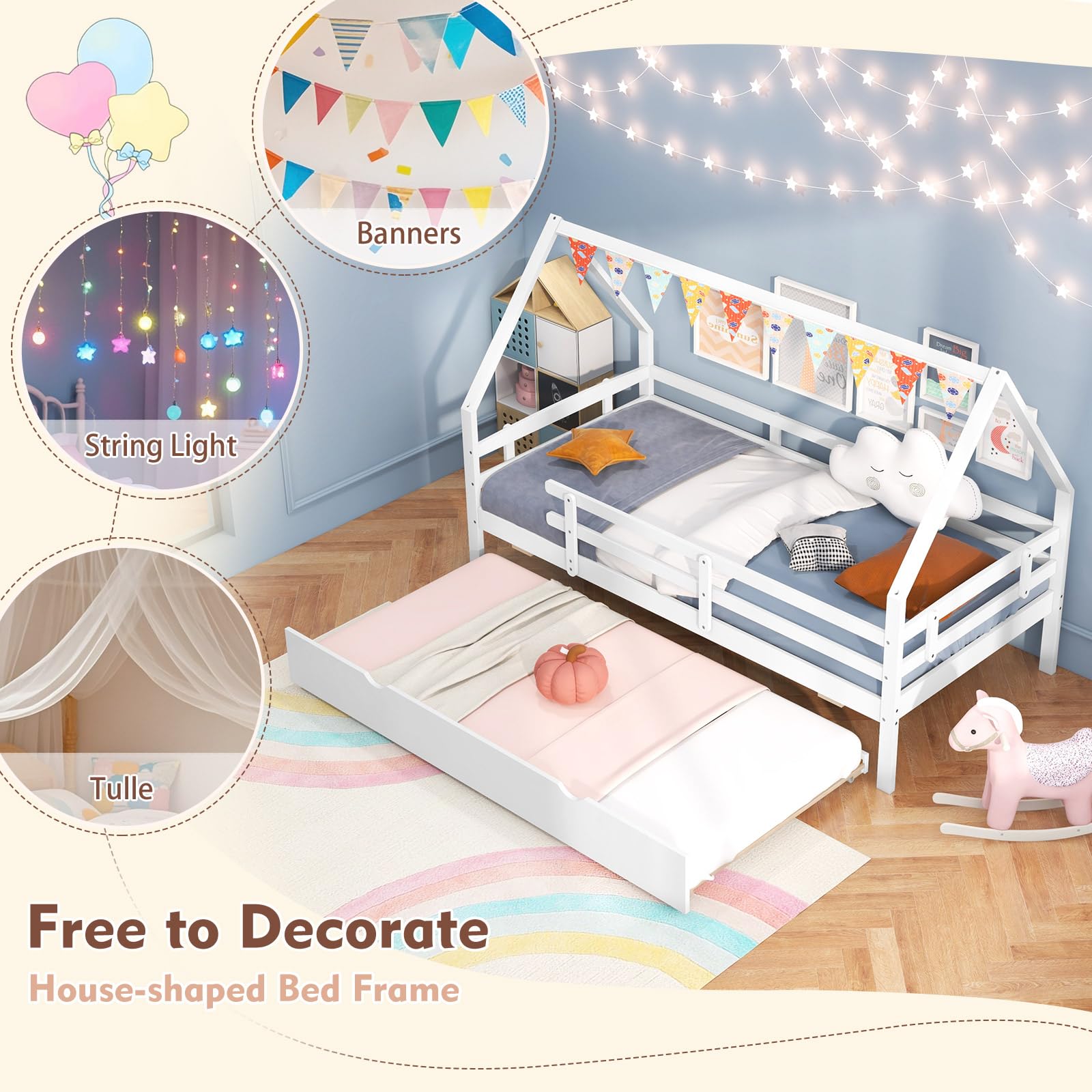 Lit adulte 90 x 190 cm, cadre de lit en pin massif avec deuxième lit et 5 RAISONS, CHOISIR NOTRE LIT CABANE Plafonds découpés pour des espaces personnalisés Contreplaqué 15+7 pour un soutien solide du matelas Barres de sécurité de 26 cm de haut pour une protection accrue Lit gigogne extractible pour un espace de couchage supplémentaire Lit gigogne extractible avec poignées découpées et roues souples SPÉCIFICATION : Couleur : Blanc Matériaux : Bois de pin, contreplaqué, MDF Dimensions totales : 205 x 97 x 136 cm (L x L x H) Dimensions de la plate-forme de lit : 200 x 90 cm (L x l) Dimensions du lit gigogne : 189 x 94 x 25 cm (L x l x H) Hauteur du garde-corps : 26 cm Épaisseur recommandée du matelas : 15 cm (non inclus) Capacité de poids du lit : 150 kg Capacité de poids du lit extensible : 150 kg Poids net : 45 kg LIVRAISONS : 1 x Lit cabane 1 x Manuel de l’utilisateur multilingue Design Personnalisable Toit Découpé Lit Cabane 90x200 Cm En Bois Avec Barrière ✔️ Petite Amélie Lit Gigogne Le lit est équipé de garde-corps d'une hauteur de 26 cm pour une excellente protection. Lit superposé triple 90 x 200 cm 140 x 200 cm lit gigogne 90 x 190... Lit simple Lit enfant cadre de lit en bois lit de rangement 90 x 200 cm... 【Conception sûre】Le lit cabane pour enfants est conçu avec un garde-corps de 26 cm de haut pour offrir une protection efficace contre les chutes. 【Lit extensible pratique】Ce lit simple 90x200 est équipé d'un lit extensible en bas, qui offre un espace de couchage supplémentaire dans votre chambre, idéal pour une chambre d'enfant ou une chambre d'amis. 【Utilisation dans de nombreuses situations】Ce lit cabane est parfait pour une chambre d'enfant ou dans une chambre d'amis comme lit d'appoint. Les découpes du toit du lit peuvent être arrangées à votre guise pour créer un espace personnalisé. Créez un espace de couchage qui vous est exclusivement réservé. Notre lit cabane est idéal pour les chambres d'enfants et les chambres d'hôtes.