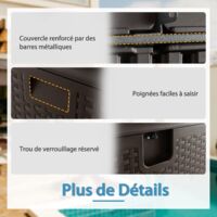 De plus, le coffre de terrasse polyvalent peut se transformer sans effort en table d'appoint, ou servir de siège supplémentaire selon vos besoins. 【Grande capacité de rangement】Avec des dimensions de 130 x 64 x 59 cm, le coffre offre un espace généreux pour le stockage de divers articles, des outils de jardin aux articles ménagers divers. 【Conception polyvalente】Doté d'une texture simulée de bois, le coffre de rangement extérieur s'harmonise à divers environnements. Le couvercle ouvrable avec vérin à gaz et design verrouillable garderont vos articles sûrs et protégés. Coffre de Terrasse 378 L, Banc de Rangement en Résine avec Couvercle De plus, le matériau sélectionné est anti-fissuration et résistant au soleil, assurant une durabilité longue durée. Le coffre de terrasse haut de gamme est fabriqué en matériau HDPE résistant aux intempéries pour une utilisation prolongée. Coffre de rangement de jardin Costway, 378 litres, étanche, avec couvercle verrouillable, pour coussins et outils de jardin, pour l'extérieur, pour terrasse... 【Facilité de montage et de transport】Le coffre de rangement de terrasse est doté de poignées intégrées de chaque côté, permettant un levage et un déplacement faciles. Description : Gardez vos essentiels extérieurs organisés et sécurisés avec le coffre de terrasse. La fonction verrouillable (cadenas non inclus) ajoute une couche supplémentaire de sécurité, empêchant tout accès non autorisé et protégeant vos objets de valeur. Coffre HDPE étanche COSTWAY Coffre De Rangement En Bois De Sapin 213L Avec Doublure Coffre Rangement Extérieur 378L La fonction verrouillable (cadenas non inclus) ajoute une couche supplémentaire de sécurité, empêchant tout accès non autorisé et protégeant vos objets de... Tandis qu'il est parfait pour le rangement à domicile ou sur le patio, le coffre de terrasse polyvalent peut également servir de siège temporaire ou de table basse extérieure, ajoutant une fonctionnalité à son design élégant.