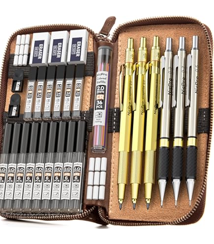 Présenté dans un coffret élégant, il est le cadeau idéal pour les professionnels, les étudiants, les débutants ou les amateurs, pour toutes les occasions spéciales. Porte Mine Nicpro 6 Pièces s Métal Dans étui En Cuir, Crayons Mécaniques Criterium 0,3 0,5 0,7 0 Kit Dessin Adulte Cadeau idéal pour ados et débutants Parfait pour Noël, les anniversaires, la fête des enfants, Thanksgiving ou la rentrée scolaire Nicpro 30 PCS Porte-ines étal dans étui Cuir, Crayon écanique... Carnet de croquis premium inclus : 14 נ21,6 cm, 100 feuilles (100 g/m²), reliure spirale supérieure pour une lecture facile. Papier sans acide et résistant aux bavures, idéal pour les crayons, les stylos et les aquarelles légères. Nicpro 2 PCS Crayons de Charpentier, Porte-ines avec 24 Recharges... Stylo 12 microns – Résistant à l'eau et sans bavure : 12 tailles de pointe : 0,05 à 3 mm + pointe pinceau (BR). Kit de dessin professionnel tout-en-un : comprend 12 feutres fins, 4 porte-mines en métal (0,3, 0,5, 0,7 et 0,9 mm), 2 crayons à croquis de 2 mm, 15 tubes de mines de 0,5 à 0,9 mm (HB), 14 tubes de mines de 2 mm avec 8 niveaux de dureté (8B, 6B, 4B, 2B, HB, 2H, 4H, 6H), 1 tube de mines de 36 couleurs, 3 gommes 4B, une gomme mie de pain, 18 gommes à capuchon, 3 Taille-crayons, carnet de croquis 14 cm x 21,6 cm (100 pages), le tout présenté dans un étui en cuir haut de gamme. Trousse en cuir : élégante et idéale pour offrir : Cet étui en cuir pleine fleur avec doublure en velours doux protège et organise vos outils. Porte-mines 0.3 0.5 0.7 0.9mm Lot Porte-Mines Artistiques Nicpro - 6 Crayons 0,3-2,0mm - Avec Mines Et Accessoires - Étui Accessoires Dessin Professionnel Idéal pour les croquis, les esquisses, les ombrages et les dessins techniques détaillés. Transportable pour dessiner en déplacement.