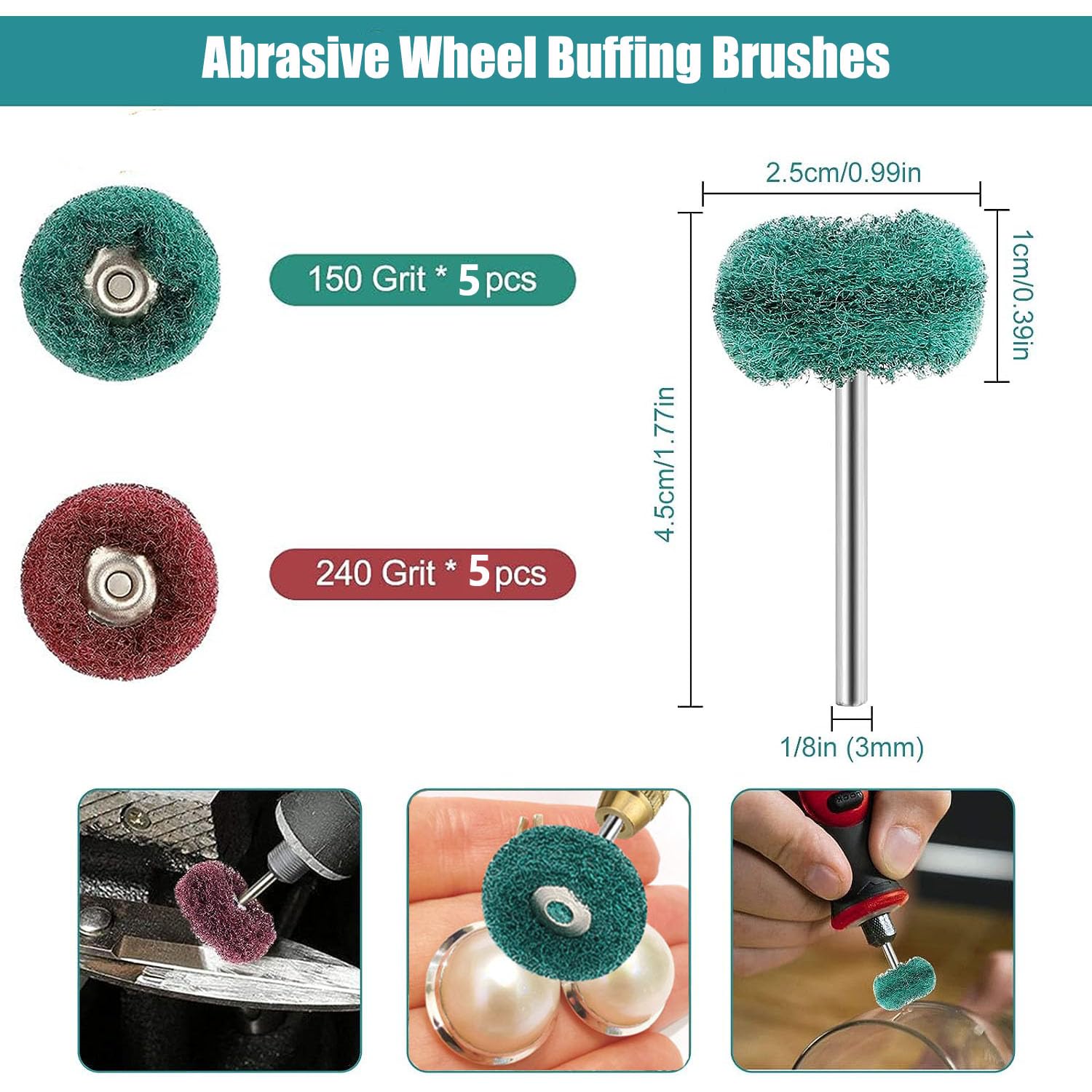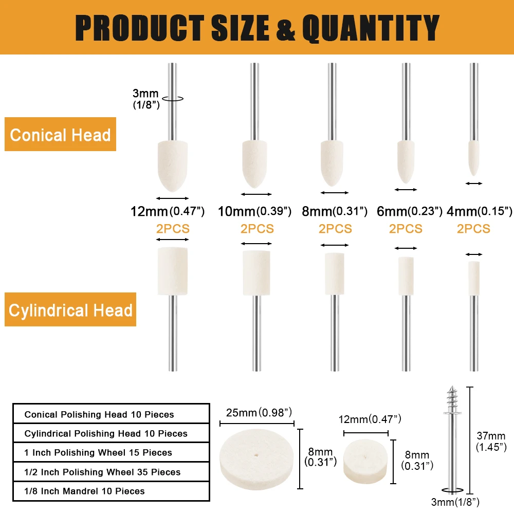 Contenu du paquet : Lot de 78 roues de polissage en laine Meuleuse,Roue de polissage et de polissage en Nylon pour outil rotatif... Outil de polissage pratique : le kit de roue de polissage est durable et réutilisable, la roue de polissage en feutre a une haute ténacité et une excellente capacité de polissage, ce qui peut rendre vos articles propres et lumineux. Une vitesse excessive peut facilement séparer les brosses et affecter la durée de vie., 2., Ne convient pas aux matériaux plus doux. 78 Roues Tige 3mm Kit De Roues De Polissage En Feutre - DIOCHE - 122 Pièces - Pour Métal Kit Polissage Laine Pour Bijoux 78 roues de polissage en laine : le kit de roue de polissage comprend 6 roues en tissu blanc, 6 roues en tissu jaune, 6 roues en feutre lâche, 6 roues en laine fine, 5 têtes de polissage coniques, 5 têtes de polissage cylindriques, 10 roues de polissage de 2,5 cm, 25 roues de polissage de 1,27 cm, 1 chiffon de nettoyage doux et 2 mandrins. Caractéristiques : 1., Ces tampons de polissage en feutre sont adaptés pour les meuleuses rotatives pneumatiques et électriques. Matériau : fabriqué en laine de haute qualité, coton, doux et confortable, résistant à l'usure et durable. Parfait pour le métal, le plastique, le bois, l'acier inoxydable, le verre, etc. Convient pour meuleuses rotatives pneumatiques et électriques. La tige de 0,3 cm s'adapte à la plupart des outils rotatifs, ce qui la rend facile à utiliser., Remarque : 1., Lors de l'utilisation de ces disques de polissage, la vitesse de l'outil ne doit pas être trop rapide. Matériau : laine, coton, métal galvanisé. Découvrez nos offres Roue de polissage pour Dremel : large sélection de produits au meilleur prix | Livraison gratuite à partir de 10€* | Entreprise française | Paiement 4x possible Idéal pour divers moules, verre, sculpture, métal, rainures de surface non métalliques, plastiques, concavités coniques et autres petites pièces., 2., Les différentes tailles de têtes de polissage sont adaptées pour fonctionner même dans des endroits difficiles d'accès. Ils sont adaptés pour nettoyer et polir le plastique, le métal, les bijoux et d'autres petites pièces. Futheda Lot de 20 3 mm Finition Abrasiv Tige en acier inoxydable