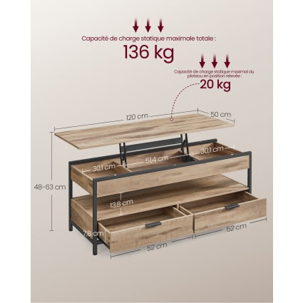 VOWNER Table Basse Relevable, Table de Salon Multifonctionnelle 3 en 1, Extensible en à Manger de Salon, Plateau Relevable, 120 L x 66,5 W x 60 H cm, Économisez de l'espace (Noir Table basse hauteur 50 cm Design Bois Noyer Style Scandinave Table Basse Réglable En Hauteur, Table De Salon Moderne Avec 2 Tiroirs Blanc Et Couleur Bois Rangement Tiroir Secret étagères Poids brut/net : 24,1 kg / 22 kg Capacité de charge : 30 kg Hauteur réglable : oui 【Rangement intelligent】Derrière son design épuré se cache un espace de stockage ultra-fonctionnel : tiroir secret, étagères ouvertes et 2 compartiments latéraux avec portes-roulantes. Table Basse Réglable en Hauteur - Pull-Out - Table Basse Extensible... 【Hauteur réglable】Passez du mode salon détente au bureau ou repas sur canapé en un clin d’œil ! 【Design épuré】Alliant esthétique scandinave et fonctionnalité, cette table affiche une finition bois effet chalet chaleureuse et intemporelle, parfaite pour les styles moderne, nordique ou japonais. 【Nettoyage sans effort】 Grâce à son design intelligent sans angles morts, un simple chiffon humide suffit pour la nettoyer entièrement. Soutenue par 4 pieds en bois massif, elle offre une stabilité totale sans aucun balancement, même en utilisation quotidienne.