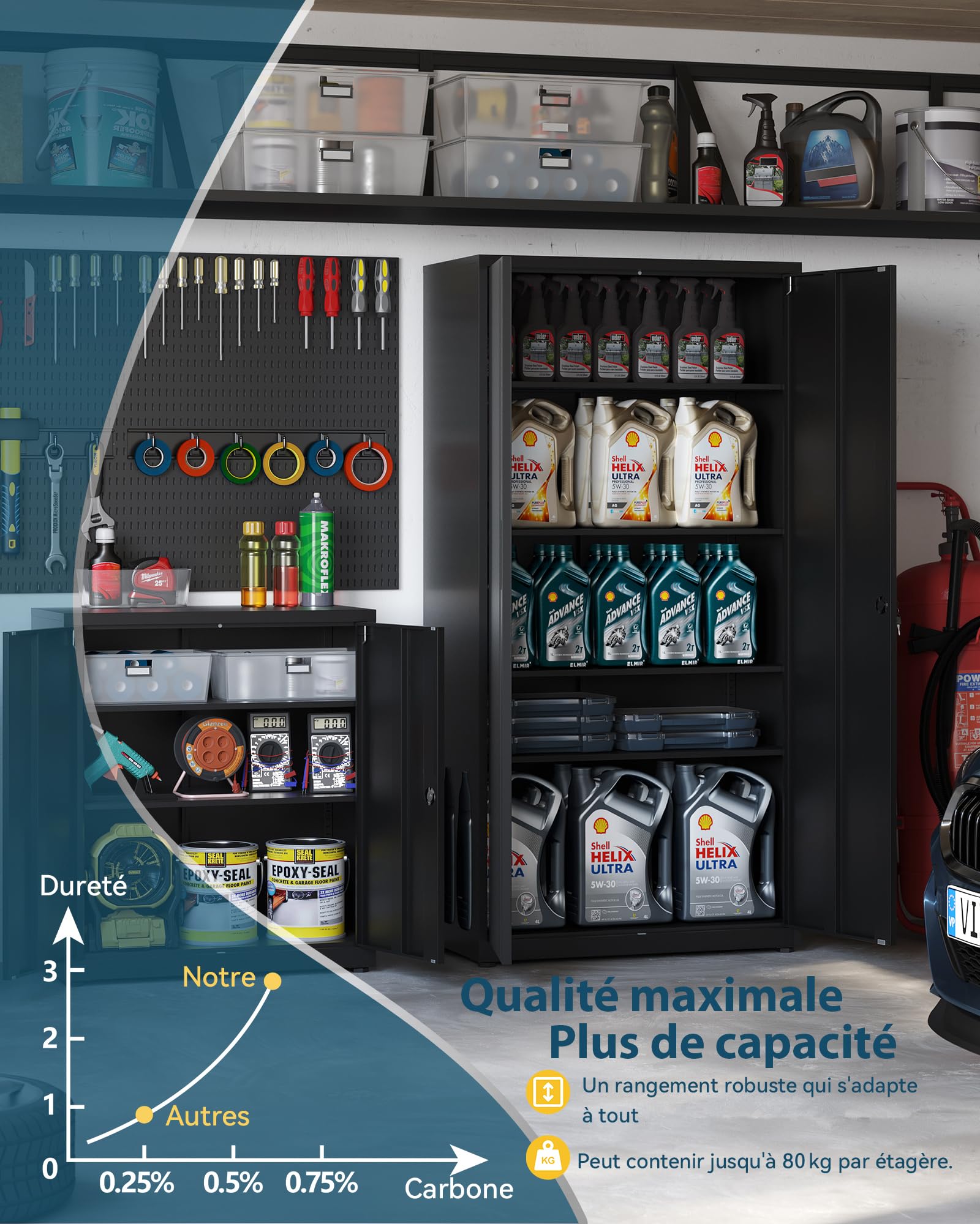 [Robuste et durable] : Cette armoire de rangement est fabriquée en acier résistant à la rouille et revêtu par poudre, ce qui garantit une structure solide et robuste. Armoire De Rangement Bureau HOMSTEEL Armoire De Rangement En Métal Verrouillable, 4 Étagères Réglables, Pour Bureau, Garage Et Buanderie, Blanc Armoire De Garage Métallique [Facile à assembler] : L'armoire de rangement pour le garage est une structure démontable. [Ajoutez de la sécurité à vos objets de valeur] : Notre meuble de rangement bureau en métal avec 4 clés est parfaite pour ranger les documents importants. De plus, elle est livrée avec des pieds réglables pour la maintenir stable même sur des sols inégaux Lorsque vous la recevez, vous devez l'assembler. Sécurisez Votre Espace : Avis sur l'Armoire de Rangement en Métal HOMSTEEL Livré avec 4 clés Les 4 clés sont livrées avec l'appareil afin d'avoir toujours un plan de secours. Chaque étagère de l'armoire de rangement métallique peut supporter jusqu'à 80 kg, et sa surface est à la fois résistante à l'eau et facile à nettoyer Niveleurs de pieds Vissez les pieds au fond de l'armoire pour qu'elle reste stable sur un sol légèrement irrégulier. [Ajustable à volonté] : L'armoire métallique verrouillable est équipée de 3 étagères réglables pour répondre à vos différents besoins. L'emballage est accompagné d'instructions de montage détaillées, faciles à assembler Découvrez notre sélection d'armoires en métal ! Faites le choix d'une armoire métallique à portes battantes ou à portes coulissantes, d'une armoire métallique comprenant 3, 4 ou 5 étages de rangement, ou encore une armoire métallique avec casiers afin de ranger vos équipements kleankin Armoire à pharmacie 2 étagères 3 niveaux avec porte... Veuillez ranger les quatre clés séparément afin d'éviter la perte des quatre clés. Étagères réglables Les trous équidistants des deux côtés vous permettent d'ajuster facilement la hauteur en fonction de vos besoins. [Armoire multifonctionnelle] : Meuble a un design simple et pratique, elle peut être largement utilisée dans les bureaux, les garages, les sous-sols, les archives, les entrepôts ou partout où vous avez besoin d'un espace de rangement supplémentaire Capacité de charge statique max.
