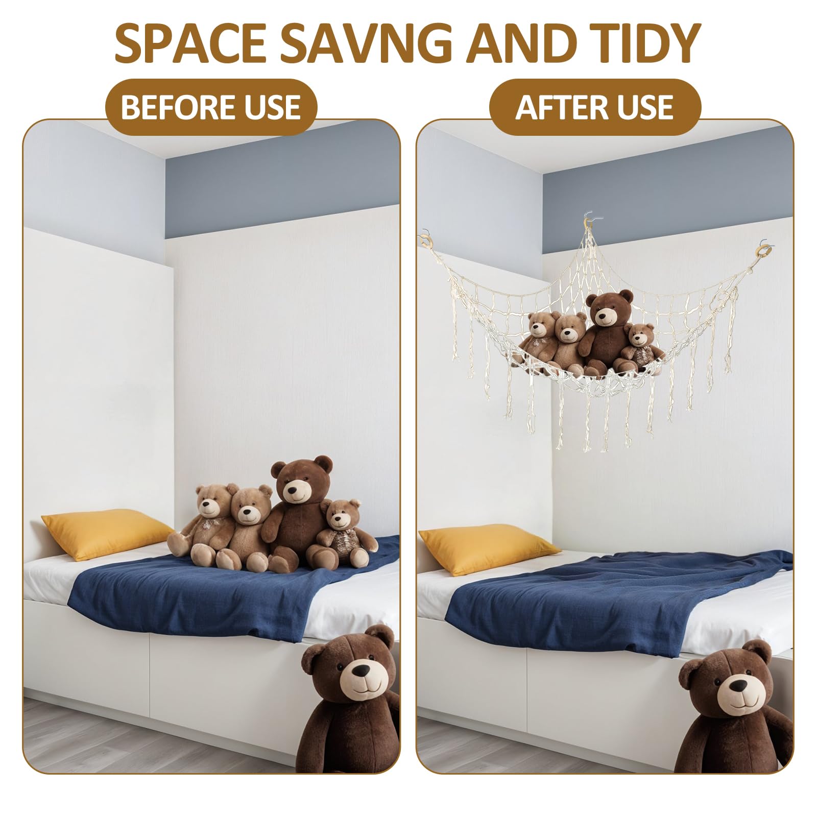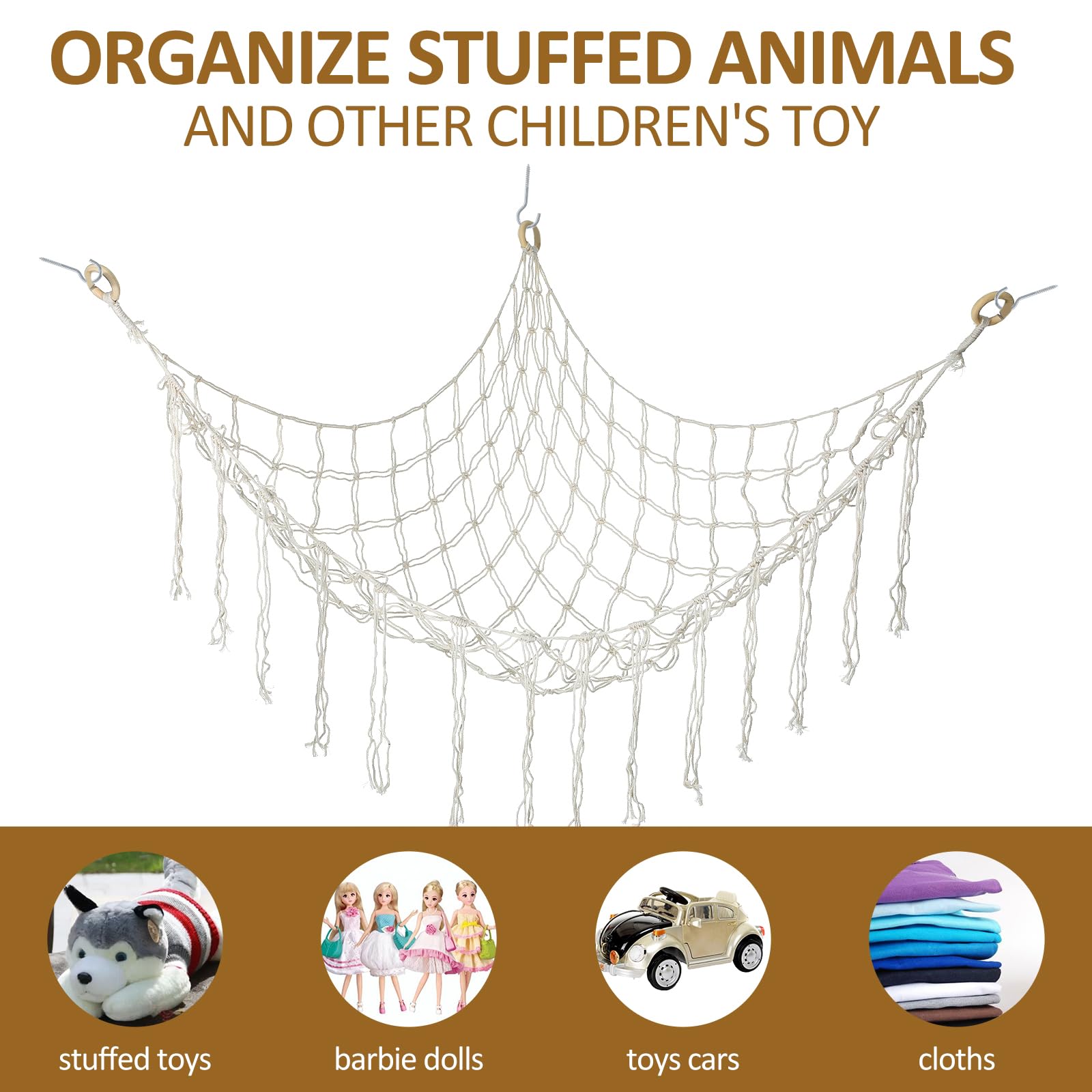 Jouet Hamac Pour Peluche - Blanc - 86*86*110cm - Intérieur - Extérieur La corde en macramé traditionnelle faite à la main maintient le hamac pour jouets en peluche, offrant une solution de rangement fiable pour les jouets en peluche de votre enfant. Hamac De Rangement Pour Jouets Grand Hamac D'angle Pour Animaux En Peluche – Décoration De Chambre Pour Adolescentes – Rangement De Jouets à Suspendre – Organiseur Pour Animaux Mignons – Décoration Bohème Esthétique Pour Chambre Hamac Déco Chambre 140x80cm Hamac en peluche durable : fabriqué à partir de coton et de fer robuste, ce hamac jouet assure une longue durée de vie. Ce hamac pour animaux en peluche est une solution de rangement pratique, peu encombrante et esthétique pour vos peluches et jouets pour bébé. Mettez de l'ordre et de l'organisation dans votre espace avec ce hamac fait main, durable et polyvalent Animal En Peluche Hamac Chaîne Peluche Animal Net Hamac Coin Suspendu... Cadeau parfait : ce hamac en peluche est un excellent cadeau pour les fêtes prénatales, les anniversaires ou toute autre occasion. Les pompons inclus et les motifs tissés à la main en font une belle pièce de décoration qui améliore n'importe quel espace. Il fournit une solution de rangement pratique et élégante pour les animaux en peluche, assurant que la chambre de votre enfant reste bien rangée et organisée. Facile à installer et peu encombrant. Il suffit de visser les crochets dans le mur et d'accrocher le hamac. Fabriqué en coton écologique, ce hamac pour peluches est parfait pour organiser et décorer la chambre de votre enfant.