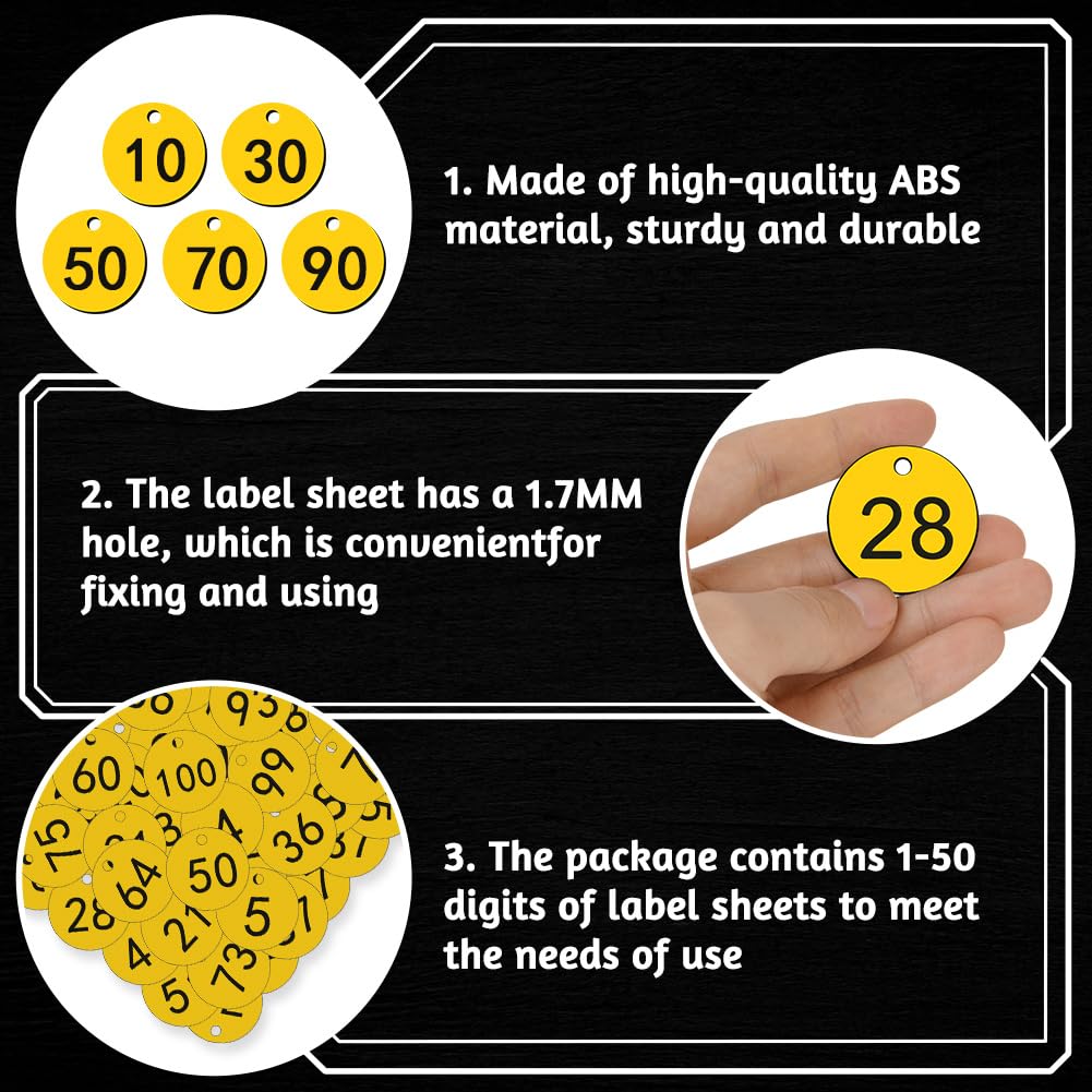 Etiquettes Ecole OFFCUP Étiquettes Numérotées En Plastique, 1 à 100 Porte-clés Numéroté étiquettes Trou Suspension Lot de 50 disques nuérotés gravés de 1 à 100 étiquettes circulaires en plastique pour nuéro de Lot de 50 disques nuérotés gravés de 1 à 50 étiquettes circulaires en plastique pour casier de... Quantité suffisante pour répondre à vos besoins ; les polices numérotées claires attirent facilement l’attention et constituent des souvenirs idéaux. Design léger et compact : Ces plaques d’immatriculation en plastique mesurent environ 3,6 cm de diamètre, sont petites et légères, faciles à transporter. Pratiques et polyvalentes : Ces étiquettes numérotées sont pratiques et polyvalentes, et permettent d’organiser et d’étiqueter divers objets. Ensemble complet aux multiples utilisations : Contient 30 plaques d’immatriculation en plastique (numérotées de 1 à 30) et 30 porte-clés. Design avec trou pour une suspension facile : Les plaques d’immatriculation gravées sont dotées d’un trou (crochet non inclus), ce qui permet de les accrocher facilement à divers endroits, comme les casiers, les sacs, les voitures et les bagages. Adaptées à diverses occasions : les étiquettes d'identification numérotées offrent un large éventail d'applications et peuvent être utilisées dans diverses situations, telles que les vestiaires, les bureaux, les restaurants, les salles de bain, les mariages, etc. Elles peuvent également être partagées, ce qui est très pratique. 100 pièces étiquettes d'oreille bétail en plastiqu... – Grandado