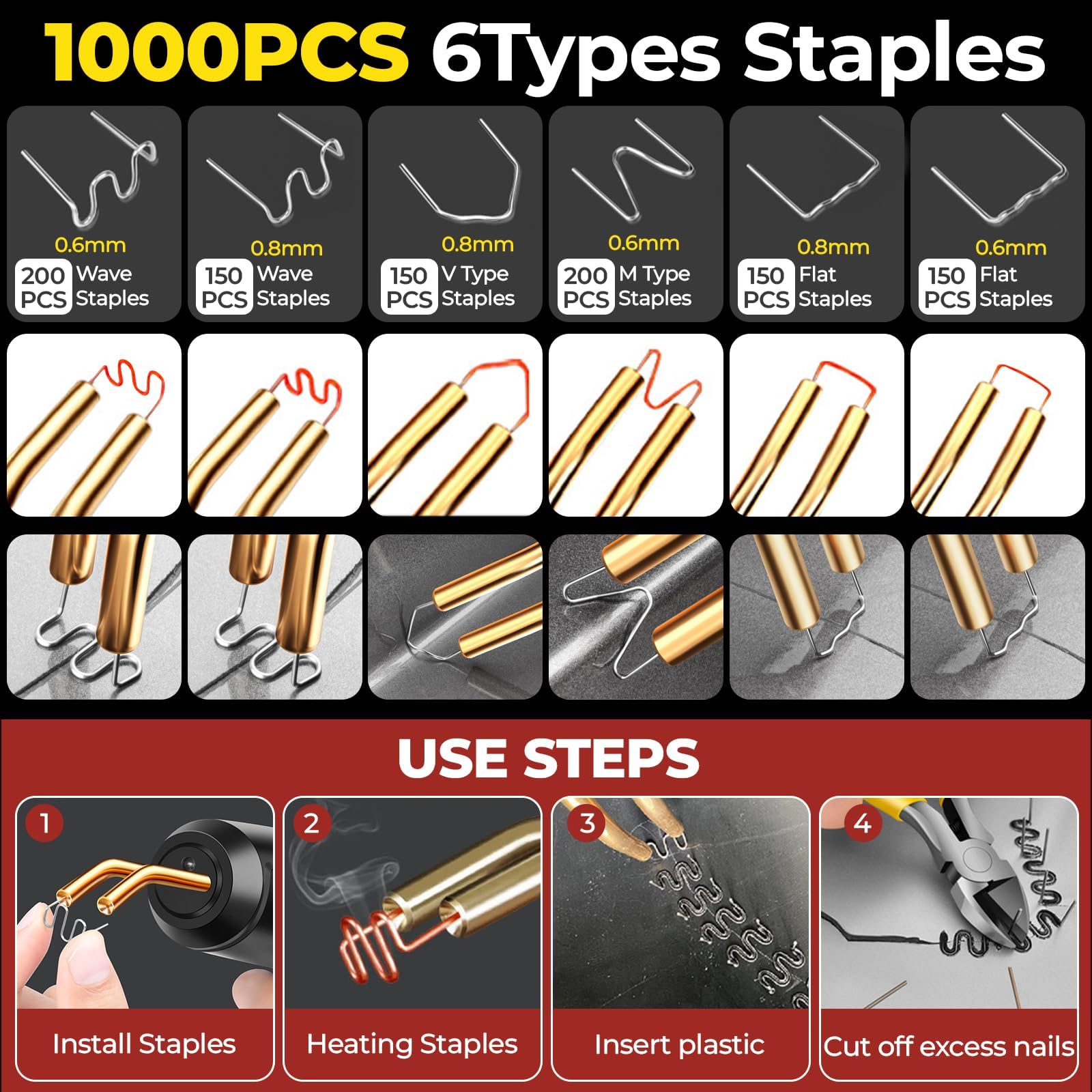 Kit de soudure en plastique : avec ce kit de réparation en plastique pour machine à souder en plastique, les lumières LED illuminent votre espace de travail, utilisez les 200 agrafes spécialement adaptées à différents types de fissures (coin extérieur, coin intérieur, grand/courbe, mince/droit) et coupez facilement les broches excédentaires avec le coupe-légumes pour obtenir une finition impeccable lors de chaque réparation. Machine Souder en Plastique 100W: Kit de Réparation de Pare-chocs de Voiture Soudure Plastique avec 200 clous de soudage · 4,64,6 sur 5 étoiles (5) · 18,99 €18... Vous aide à terminer la réparation des pièces en plastique de votre voiture plus rapidement, il n'endommage pas la voiture et la surface en plastique, et il est très solide. Plage de température : 500 °C (max). Soudage Plastique TONYSA Poste à Souder En Plastique - Kit De Réparation De Pare-chocs De Pistolet à Souder Plastique 100W Poste à souder en plastique 100 W : puissance de chauffage de 100 W, il chauffe si rapidement, 1 à 10 secondes suffisent complètement pour les pièces plus fines, il peut être placé avec précision. Débranchez l'appareil pour obtenir une réparation propre et professionnelle. (4 types de boulons de soudure 50 pièces chacun). Léger et portable : libérez votre bricoleur intérieur avec le kit de réparation de pare-chocs en plastique portable, idéal pour la réparation des fissures en plastique, la restauration de pare-chocs de voiture, la réparation des réservoirs d'essence, les réparations mécaniques de la voiture et la revitalisation d'objets en plastique dans la maison. Facile à utiliser : aucune formation nécessaire, juste quelques secondes pour apprendre à utiliser. Y compris le pare-chocs de voiture, les phares de voiture, la moto, l'aspirateur, les jouets, les scooters, les anneaux en plastique et les besoins quotidiens en plastique. Matériau du produit : boîtier en plastique Contenu : 1 poste à souder en plastique., 200 agrafeuses à chaud., Conseils : 1., Si vous avez des questions sur notre machine à souder plastique, n'hésitez pas à nous contacter Avec un chauffage rapide, 800 agrafes chaudes de 4 types, un ensemble complet d'accessoires et une lumière LED intégrée, ce pistolet de soudage à agrafes chaudes répond sans effort à vos besoins de réparation de plastique, idéal pour divers scénarios de réparation de plastique Large utilisation : Ce superbe pistolet à souder vous permet de réparer des coûts de réparation coûteux sur toutes les choses en plastique. Il suffit de sélectionner les pinces appropriées, de brancher le support en laiton, d'appuyer sur le bouton d'alimentation et d'attendre quelques secondes jusqu'à ce que les agrafes se fondent lentement dans la partie en plastique. EJ.LIFE Clous de Soudage en Plastique Thermofusibles, Clous de