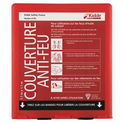 Boule Anti Feu Couverture Anti-feu Incombustible En Sachet Avec Panneau | Seton FR Extincteurs Incendie Avec ses dimensions de 1,1 x 1,1 mètre, cette couverture peut recouvrir complètement un feu de poêle, coupant son alimentation en oxygène et éteignant les flammes sans risque de propagation, contrairement à certains extincteurs Prévention incendie | Sécurité incendie | FR Contenu du coffret 1 x couverture anti-feu Kidde FB1 1,1 x 1,1 m Couverture anti-feu - F213 - étiquettes et panneaux d'incendie et de sécurité - picto et texte... Certifiée BS EN1869 – 1997 Elle est conçue pour être installé dans un endroit accessible en permanence. Elle permet d’étouffer les départs d’incendies ou de couvrir une personne dont les vêtements auraient pris feu. Description du produit Couverture Anti-feu 1,1 x 1,1 FB1., Cette couverture anti-feu est livrée prête à l’emploi.