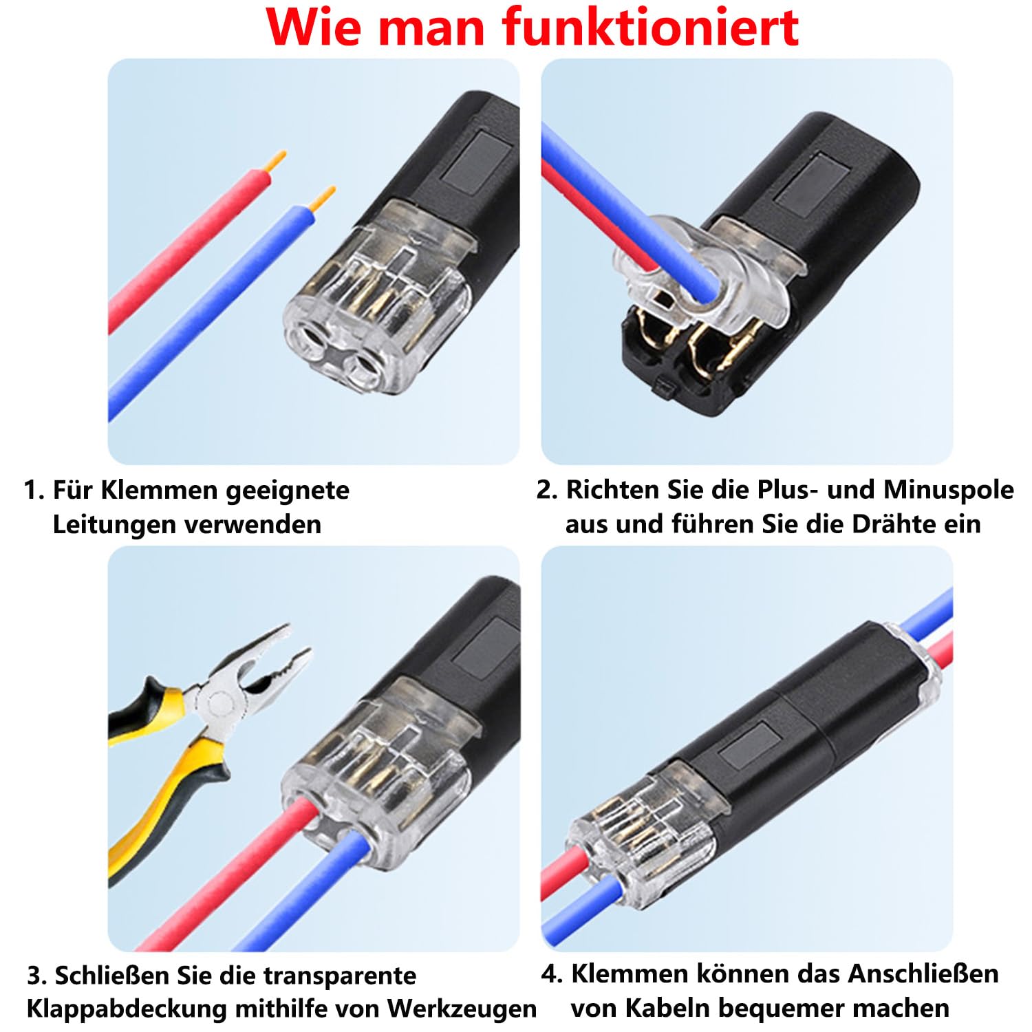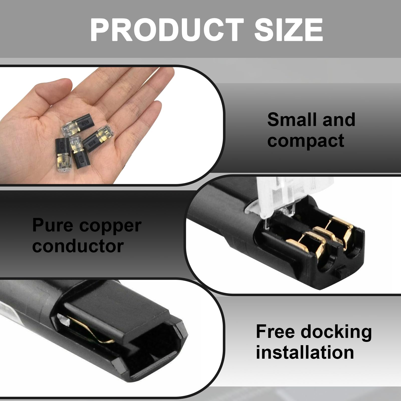 Les connecteurs de câble basse tension sont faciles et pratiques à utiliser, ce qui permet de gagner du temps et de réduire les erreurs. Connecteur Voiture Audio Led 15 Pièces Connecteurs En T 2 Broches Pour Câbles Électriques 20/22 AWG, 2 Broches Connecteur Electrique Sans Soudure, Étanche, Pour Voiture Et Éclairage LED, Installation Rapide Sans Soudure Connecteurs électriques Rapides 2 Broches Spécifications : - Nom du produit : Connecteurs rapides droits LED D2 - Couleur du produit : noir, transparent - Matériau du produit : Polycarbonate, cuivre pur - Dimensions du produit : 21., 8mm*9., 8mm*6., 15mm - Tension nominale : - Courant nominal : - Température de l'enveloppe : - Froideur de l'enveloppe : -45°C - Diamètre de fil applicable : 0,35~0,75mm2 (18-22AWG), plage de diamètre extérieur : 1,5mm~2,1mm - Le produit comprend : Paquet de 10 Caractéristiques : - Matériaux de haute qualité, étanches à l'eau et à la poussière, résistants à la chaleur, durables. Matériau de haute qualité : le clip de connexion à 2 broches est fabriqué en polycarbonate et laiton ignifuges, qui est imperméable, résistant à la poussière, à... - Largement utilisé pour une variété de connexions internes et à faible perte de tension continue, idéal pour la plupart des montages audio, haut-parleurs, vidéo, barres lumineuses à LED, véhicules et autres équipements électriques. La conception enfichable permet aux utilisateurs d'éviter tout danger lors de la connexion des circuits. 10 connecteurs à 2 broches pour câbles 18-22 AWG. Sertissage rapide sans dénudage - insère et presse, c'est fait ! En polycarbonate et laiton ignifuges... - La conception enfichable permet à l'utilisateur de déconnecter l'alimentation électrique lors de l'entretien ou du remplacement de l'équipement. - Conception innovante, pas besoin de dénuder le fil, vous pouvez rapidement épisser le connecteur, simple et facile à utiliser. 【Environnment de Fonctionnement】: La tension nominale est inférieure à 300 V, le courant nominal est inférieur à 10 A, et il peut généralement être utilisé dans un environnement étanche à l'humidité et ventilé de -20 °C à 80 °C. Connecteurs électriques Daytona 2 broches Type 250 - Atelier & Stand - Utilisation sûre, la fiche du câble basse tension est étanche à l'eau et à la poussière afin d'éviter tout risque de choc électrique. Vous pouvez utiliser les connecteurs de câble pour connecter rapidement les fils.