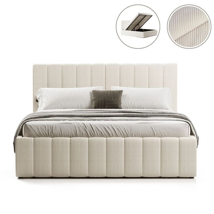 Lit double 160x200 cm en tissu bouclé beige et pieds en bois d'hévéa... Ne pas dépasser la capacité de charge recommandée. Ne pas utiliser de couettes ou d'oreillers trop épais pour les enfants de moins de 12 mois., Lits en tissu , Couleur blanc écru Lit 160x200 Avec Sommier Coffre Lit Coffre En Tissu Bouclette écru 140x190 Cm GEORGINA Lit Coffre 160x200 Avertissement De Sûreté Lire attentivement les instructions d'assemblage et de montage. Le tissu bouclette écru offre une finition douce qui s'intègre parfaitement dans une décoration moderne ou classique. Sa tête de lit rembourrée ajoute un... Description du produit Le lit GEORGINA en tissu bouclette écru, avec sa tête capitonnée, combine élégance et confort. Lit rembourré 160x200 lit coffre avec rangement - lit capitonné blanc