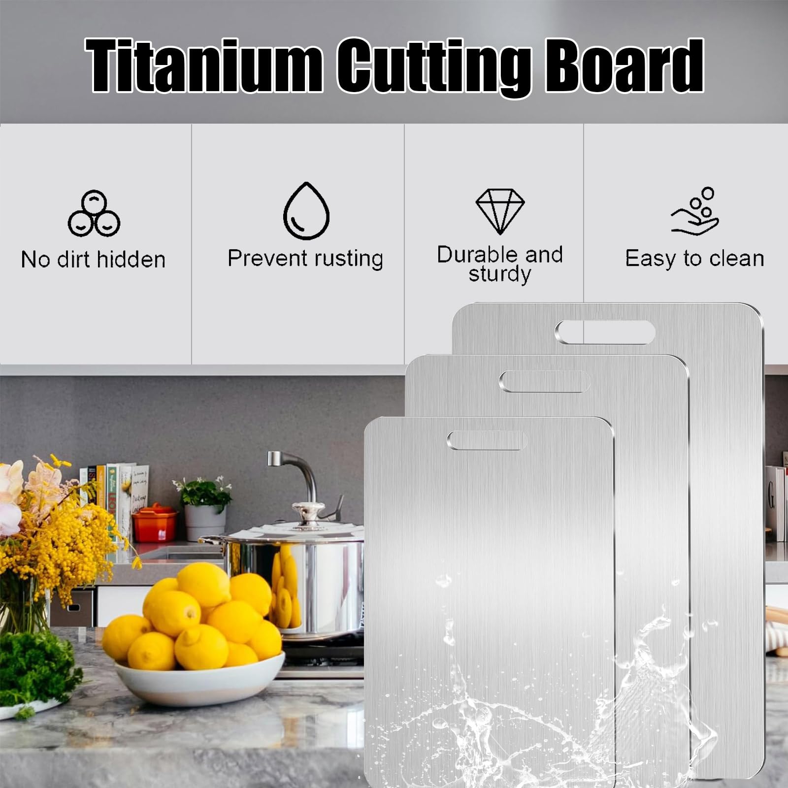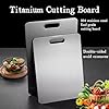 Matériau en titane durable. Ensemble de 3 Planches à Découper en Titane, Nouvelle Mise à Dites adieu aux taches et aux odeurs et profitez d'une planche à découper propre et prête à l'emploi à chaque fois Surface Double Face Anti Contamination Planches à Découper En Titane Pour La Cuisine, Planches à Découper En Planche Durable Lave-vaisselle Son design fin permet un rangement facile, tandis que la surface double face empêche la croix et protège vos couteaux de ternir. Pratique des deux côtés. Taia Planche à découper en titane 100 % pur titane pour cuisine, planches à découper en acier... Design double face : notre planche à découper en titane dispose d'un design double face, parfait pour séparer les morceaux de viande et de fruits/légumes, empêchant efficacement la contamination croisée, et offrant assez d'espace pour tous vos besoins de coupe Élimine les défauts courants tels que les marques de couteau et les odeurs, offrant une excellente surface de coupe Ultra légère (seulement 199 g) et super résistante, elle mesure 150 x 250 mm pour une épaisseur de 1,2 mm. Le titane est sans goût, sans odeur et non toxique... Caractéristiques : Matériau : titane de haute qualité., L : 36 x 25 cm., M : 34 x 23 cm., S : 29 x 20 cm Portable et peu encombrant. Gardez vos couteaux tranchants et durables avec notre surface en titane avancée Améliorez votre cuisine avec la planche à découper en titane Katuchef - Ultra durable, facile à nettoyer et passe au lave-vaisselle. Disponible en plusieurs tailles : 35,1 x 23,9 cm, 39,9 x 27,4 cm et 45,7 x 30 cm.