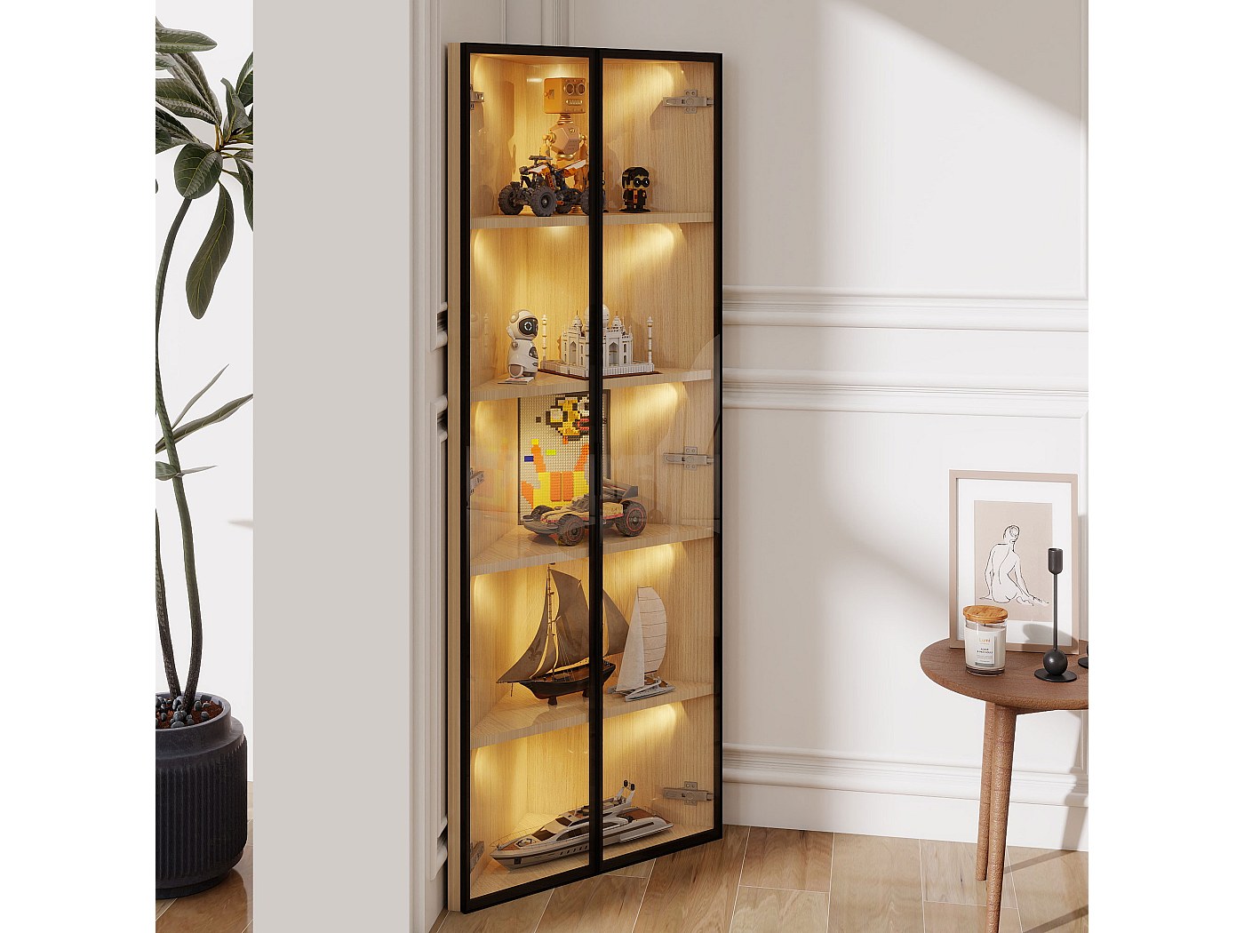 Cette vitrine longue et étroite peut facilement être placée à côté du canapé ou dans un coin du salon, même dans un espace restreint. Ce système est plus intelligent et plus économe en énergie. Elle permet d'accueillir davantage d'objets dans un espace réduit. Vitrine avec 7 couleurs vitrine d'éclairage LED, vitrine sur pied... Assemblage facile : Aucun outil supplémentaire n'est requis ; une seule personne peut le réaliser rapidement. Les trois couleurs bleu, jaune et blanc peuvent être commutées à tout moment. Vitrine sur pied avec 1 porte, 4 étagères en verre réglables en hauteur... Si vous n'êtes pas détecté dans un délai de 30 minutes, la lumière s'éteint automatiquement, offrant une expérience plus conviviale et de meilleures économies d'énergie. La partie supérieure est constituée d'une cloison en verre réglable à trois couches. Vitrine En Verre Avec Porte Gurexl Vitrine D'angle En Verre,Vitrine Sur Pied Avec | WhichOne Vitrine D'angle Verre LED Si vous y rangez des objets fragiles, une serrure peut mieux garantir la sécurité de vos biens. Le jaune est lumineux, le bleu est apaisant et le blanc est naturel. Les noms des pièces et les instructions sont identiques, ce qui facilite grandement l'assemblage et vous permet de vous familiariser rapidement avec nos produits. Suivez les instructions graphiques pour l'installation étape par étape. La serrure de porte offre une sécurité accrue pour vos objets. Chaque pièce est étiquetée avec un numéro de série et tous les outils nécessaires sont inclus. Il peut être utilisé non seulement pour le stockage et l'affichage, mais aussi comme décoration pour rendre la chambre plus belle Petite taille et facile à placer La porte s'ouvre et se ferme d'une simple pression et la conception sans poignée confère à ce produit une touche moderne. Description du produit Vitrine moderne en verre brillant Si personne ne se trouve à proximité dans les 30 secondes, elle s'éteint automatiquement. Convient aux chambres à coucher Test : vitrine sur pied LED 7 étagères blanc Lorsque vous vous trouvez à moins de deux mètres, le capteur vous détecte et allume la lumière.