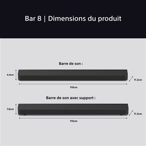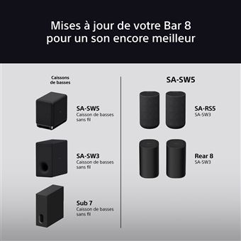 Enceintes Arrière Design BRAVIA Theatre Rear 8 | Enceintes Arrière Sans Fil Supplémentaires | Home Cinema Et Barres De Son | France Barre De Son Tv Sony BRAVIA Theatre System 6 | Dolby Atmos® | Home Cinema et barres de son BRAVIA Theatre Rear 8 | Haut-parleurs arrière sans fil supplémentaires... Ils libèrent également la fonction IMAX Enhanced sur nos barres de son et caissons de basses, de sorte que vous savez que vous entendez exactement ce que les créateurs de films ont voulu. Conçus pour correspondre parfaitement à vos autres produits BRAVIA Theatre, et de manière sans fil, ces haut-parleurs arrière ont été soigneusement conçus pour se fondre dans votre intérieur, sans l'encombrement des câbles. Associez-le avec un BRAVIA Theatre Bar 9 ou BRAVIA Theatre Bar 8 pour profiter d'une coordination parfaite des bords arrondis, d'un tissu doux et d'un style intemporel. Votre salon sera transformé en salle de cinéma car l'arrière 8 garantit que chaque pouce est rempli d'un son surround puissant. Vous pouvez même utiliser l'application Sony | BRAVIA Connect pour contrôler l'ensemble de votre système de divertissement à domicile directement depuis votre smartphone. Améliorez votre expérience sonore ambiante : ces haut-parleurs arrière garantissent que chaque centimètre de votre pièce est couvert, et font passer la cartographie du son spatial à 360° et IMAX Enhanced au niveau supérieur. Conçu pour correspondre : façonné et fini pour se fondre parfaitement avec nos dernières barres de son (ainsi que votre décoration intérieure), placez les haut-parleurs sans fil n'importe où derrière vous et votre espace restera propre. Barre de son Sony Dolby Atmos avec caisson de basses et haut-parleurs arrières Bravia Theatre Bar 8 | HT-A8000, SA-SW3 et SA-RS3 ; Prix normal 2 449,97 $ ; Prix...