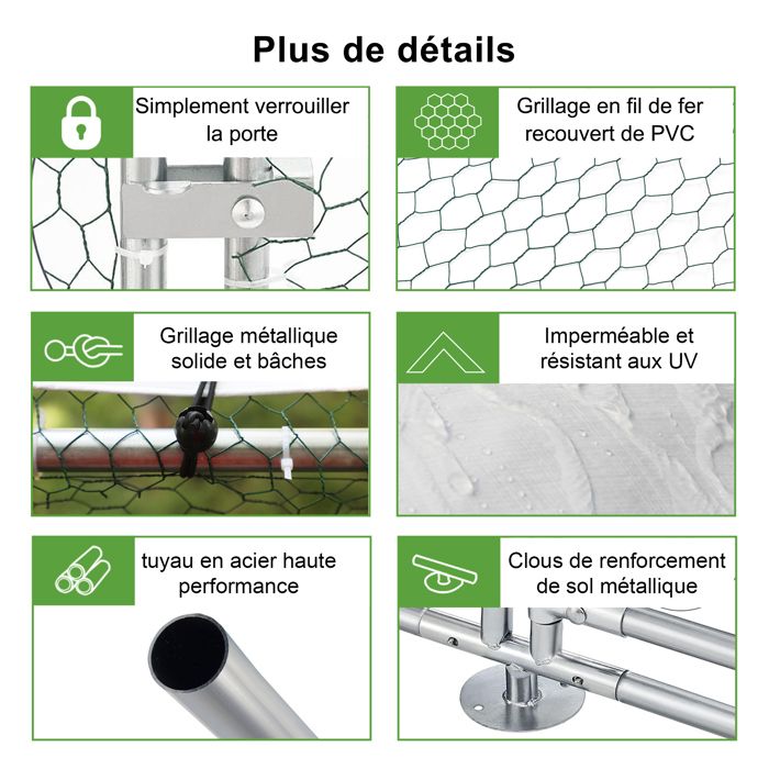 Cecaylie Enclos poulailler chenil volière extérieur, avec Serrure Livré avec notice de montage ; les connecteurs à ressort permettent un assemblage rapide. Il est recommandé d'être deux personnes pour faciliter l'installation Enclos Poulailler Extérieur 3x1.5x2m Poulailler Enclos 3x1,5x2 M Avec Serrure De Sécurité Poulailler 2 Poules - Dimensions de la porte (L x H) : 65 x 167 cm - Un accès généreux pour un entretien facilité de votre poulailler et enclos pour poules. Optez pour la Sécurité Maximale: Verrou renforcé et treillis hexagonal PVC font de cet enclos poule un enclos poulailler impénétrable, garantissant la sûreté absolue de votre poulailler. VEVOR Enclos Poulailler Extérieur Métal 400x300x200 cm Grand Enclos... Livré avec : - 1 x Structure du poulailler /enclos pour poules - 1 x Bâche de protection pour enclos poulailler - 1 x Notice de montage pour votre poulailler Profitez d'un Espace Optimisé: Avec ses 3x1,5x2m, ce poulailler et enclos poule offre un enclos poulailler spacieux et parfaitement ventilé pour le bien-être de vos animaux. Bénéficiez d'une Polyvalence Expert: Ce poulailler nouvelle génération est un enclos poule et enclos poulailler universel, accueillant poules, lapins et toute votre basse-cour. Adoptez un Montage Éclair: Système plug-and-play breveté : votre poulailler et enclos poule se montent en 15 minutes chrono pour un enclos poulailler immédiatement opérationnel.