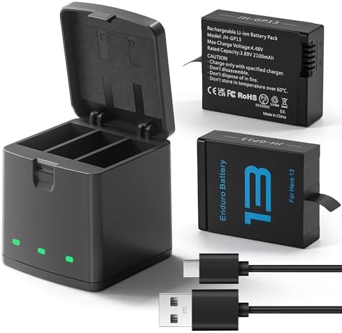 Kit Batterie GoPro Batterie GoPro Enduro Pour Caméra GoPro HERO13 Black Go Pro Hero Boîtier de chargeur intelligent à 3 emplacements LED]Chargez 3 batteries simultanément en seulement 3 heures (câble USB-C inclus). Le chargeur de batterie Hero 13 Black est doté de voyants LED indépendants (rouge = charge, vert = pleine) pour une surveillance en temps réel Pack de 2 Batteries Rechargeables GoPro Enduro (HERO13 Black) - Accessoire Officiel GoPro [Boîtier de Chargeur LED Intelligent à 3 Fentes] Chargez 3 batteries simultanément en seulement 3 heures (câble USB-C inclus) Chargeur de batterie Hero 13 Black avec des indicateurs LED séparés (rouge = charge, vert = plein) pour une surveillance en temps réel Cette boîte de chargement et de rangement est spécialement conçue pour la GoPro Hero 13 Black, garantissant une compatibilité parfaite. TELESIN Kit Chargeur... Il s'intègre parfaitement dans votre sac photo et est facile à emporter Le chargeur Hero 13 prend en charge les batteries OEM [Durée Enregistrement Prolongée] 3 packs de batteries Enduro Hero 13 de haute capacité fournit à Hero 13 Black une durée de vie prolongée, une longue durée de fonctionnement et aucun effet de mémoire. [Compatibilité Totale] Le chargeur de batterie Hero 13 noir entièrement décodé est compatible avec GoPro Hero 13 noir sans erreurs ni avertissements.
