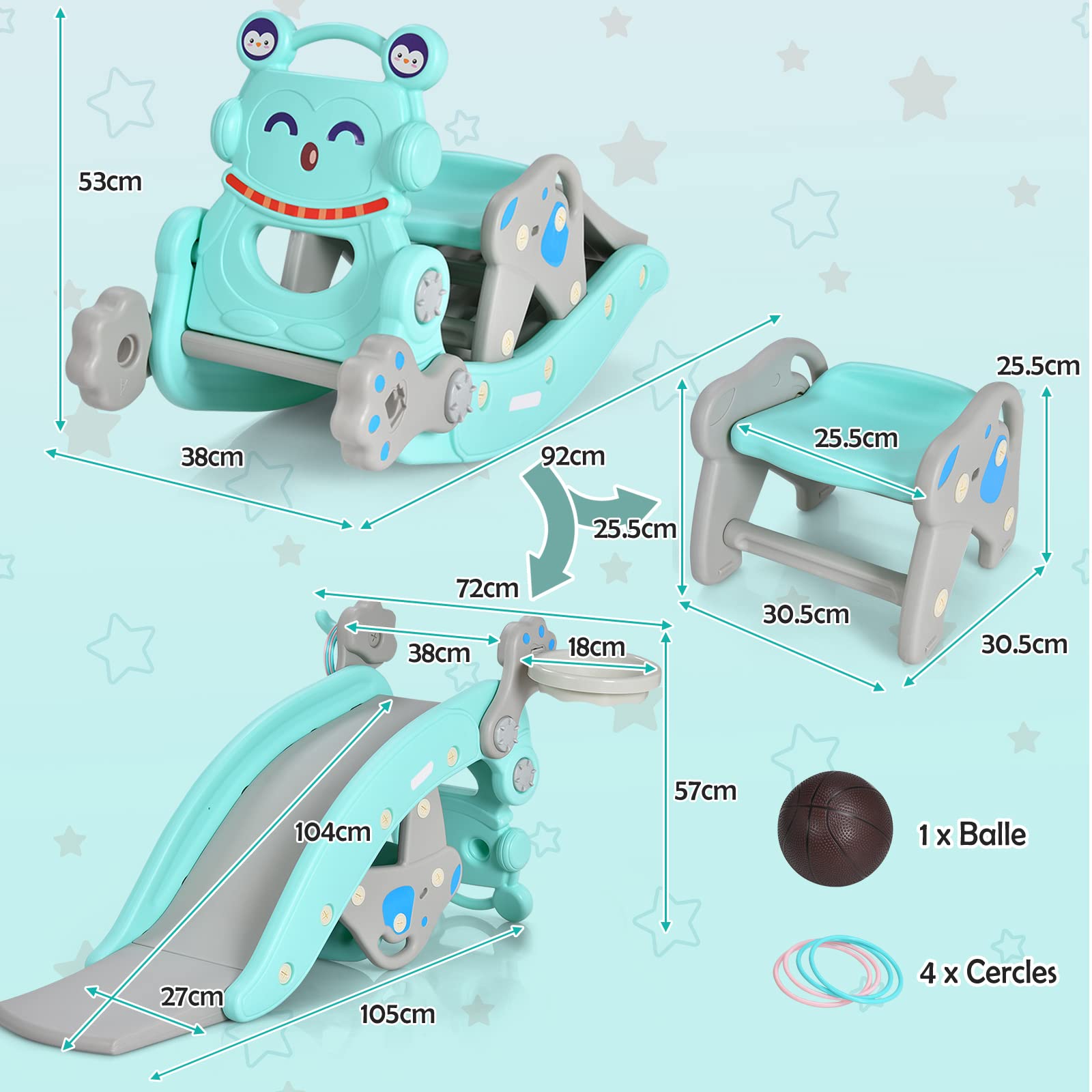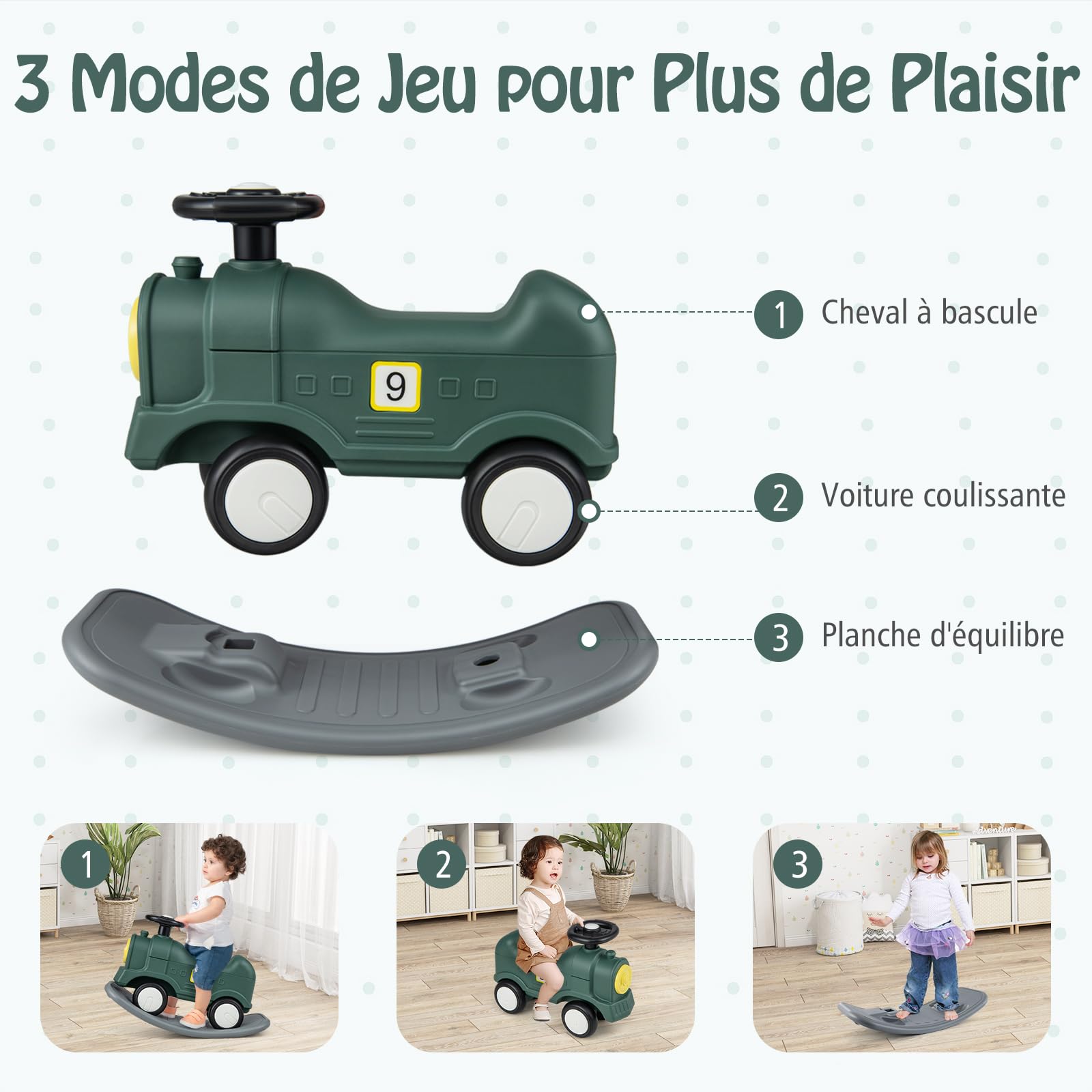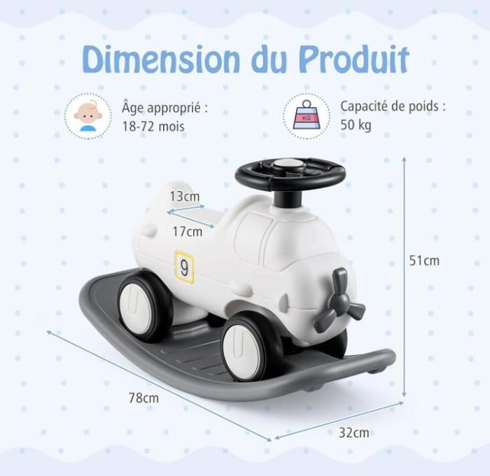 De plus, la construction robuste et la barrière de sécurité rendent son utilisation encore plus sûre. Barrières de sécurité amovibles — Notre cheval à bascule est conçu avec des garde-corps amovibles des deux côtés pour mieux protéger la sécurité des enfants. Les poignées cylindriques lisses sont faciles à saisir, tandis que le siège spacieux et le repose-pieds supplémentaire assurent le confort. L'angle d'inclinaison raisonnable de 11-22° permet au cheval à bascule de se balancer doucement d'avant en arrière tout en évitant le risque de basculement. Cheval à Bascule en Bois en Forme Zèbre avec Garde-Corps Caractéristiques Cheval à bascule peut favoriser l’équilibre, la coordination mains-pieds Adorable motif de poney attirera l'attention des enfants 11 à 22 degrés d’inclinaison pour empêcher efficacement le basculement Garde-corps de sécurité amovibles pour mieux protéger la sécurité des enfants Siège large avec dossier et repose-pieds pour une expérience assise confortable Surface lisse et les matériaux sains ne nuiront pas à votre bébé Avec l'aide du manuel, le processus d'installation est simple et facile Spécification Couleur : blanc Matériau : bois massif, MDF, contreplaqué Dimension hors tout : 68 x 27 x 48 cm (L x l x H) Hauteur d'assise depuis le sol : 29,5 cm Âge applicable : 3+ ans Capacité de poids : 40 kg Poids net : 3 kg Livraisons 1 x Cheval à bascule 1 x Manuel de l’utilisateur Conçu pour les enfants de plus de 3 ans, il peut supporter un poids allant jusqu'à 40 kg. À propos de cet article [Garde-corps amovible unique :]Notre cheval à bascule est doté de rebords amovibles des deux côtés pour mieux protéger la sécurité des enfants, ce qui le rend adapté aux plus de 3 ans. [Bascule confortable:]La base incurvée permet aux enfants de se balancer vers l'avant ou vers l'arrière avec 11 à 22 degrés d'oscillation, évitant ainsi le... Grâce à sa construction simple et aux instructions détaillées, il est très facile à installer. Description Notre cheval à bascule en bois accompagnera votre enfant dans une enfance inoubliable ! De plus, la conception amovible vous permet d'installer ou d'enlever facilement les garde-corps en fonction des besoins de votre enfant à différents stades de son développement. Cheval à Bascule Bois Enfants Labebe Cheval à Bascule Enfant (12-36 Mois), Bascule Bois, Jeux Bascule Pour Petits Enfants Bébé Garçons Et Filles, Jouet à Bascule Bebe, Cadeau D'anniversaire Créatif Jouet En Bois Massif Sécurisé Fabriquée en bois de hêtre et certifiée pour la sécurité, elle convient aux enfants âgés de 1 à 5 ans et combine une arche d'escalade, un tunnel rampant, une arche à bascule et un cheval à bascule pour un divertissement sans fin De plus, les enfants peuvent utiliser leur imagination pour dessiner librement différents motifs sur la surface du cheval à bascule.