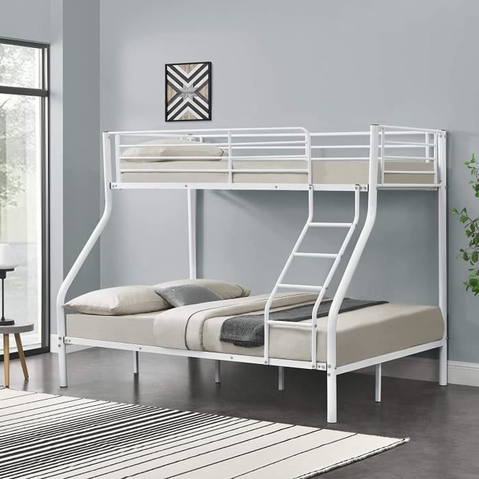 Lit 3 Places Enfant Lit Superposé Enfant 140 X 200 Cm En Métal Avec Barrière - Noir | Leroy Merlin Lit Double Et Simple Empilé Lit superposé Premium XL [neu.haus] Cadre de lit superposé en métal neu.haus] Lit superposé en Métal avec 2 Matelas Armature Massive pour 3 personnes 210cm x 147... Les matelas ont une caractère respirante et perméable à l'humidité et l'air plus haute, chaud en hiver et froid en été. A noter : L'oreiller, couverture et les objets déco ne font pas partie de l'offre. Ne pas laver avec du chlore ou d'autres détergents chimiques. Idéal pour la chambre d'enfants. Tenir à l'écart des sources de chaleur. Notre cadre de lit superposé garantit le confort pour 3 personnes - 2 personnes peut coucher confortable sur le lit dessous et 1 sur le lit dessus. Dimensions: - Entière (Longueur x Largeur x Hauteur): 210cm x 147,5cm x 168cm - Tailles des matelas (Longueur x Largeur x Hauteur): 200cm x 140/90cm x 16cm - Hauteur des barrières du lit du dessus: 36 cm - Distance entre les 2 lits: 97 cm - Distance entre le sol et le lit dessous: 33 cm , Couleur: blanc Notre cadre de lit superposé garantit le confort pour 3 personnes - 2 personnes peut coucher confortable sur le lit dessous et 1 sur le lit dessus. Idéal pour la chambre d'enfants. Les matelas ont une caractère respirante et perméable à l'humidité et l'air plus haute, chaud en hiver et froid en été. Produits de la marque [en.casa] et [neu.haus