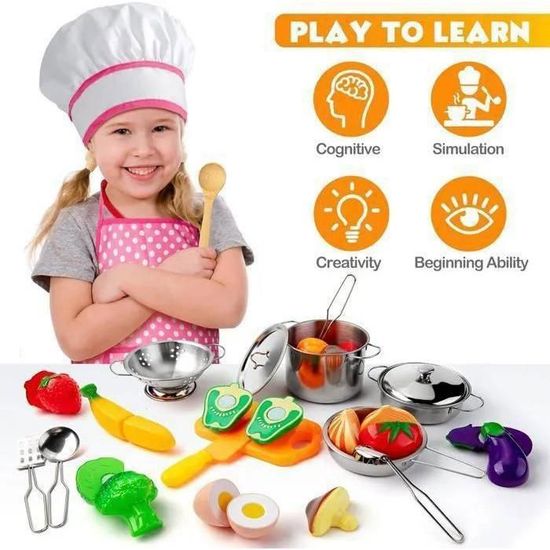 Jouet Enfant 3 Ans Cuisine Jouet Enfant SLEMAKO - Set Ustensiles Casseroles Jeu Rôle 3-6 Ans Ustensiles Cuisine Enfant 3 Ans --Les jouets de cuisine sont fabriqués en plastique ABS de haute qualité, sûr et durable, facile à nettoyer. Ustensiles Cuisine Jouet Réaliste éducatif Accessoire Cuisine Enfant, Chef Jeu De Rôle Avec Ustensile Dinette Enfant Améliorer la coordination œil-main des enfants et les compétences de base en cuisine, promouvoir l'interaction entre les enfants et les amis ou les parents. La taille parfaite pour les enfants dans leur cuisine ludique. L'ensemble de jouets de cuisine pour enfants comprend 4 casseroles et poêles en acier inoxydable, des ustensiles en bois, un tablier et une toque, ainsi que des jouets pour couper les légumes. Parfait pour le jeu de rôle et l'imagination des enfants Jouets de Cuisine pour Enfants : Notre ensemble de cuisine complet comprend une bouilloire, une cocotte-minute, une poêle, une marmite, une planche à... Avertissement De Sûreté À utiliser sous la surveillance d'un adulte Les jouets de cuisine à rôle riche fourniront aux enfants une expérience de cuisine authentique et stimulante. 【Ensemble de jeu de cuisine réaliste】 Avec des formes réalistes et des fonctions de simulation d'ustensiles de cuisine, tous les couvercles d'ustensiles de cuisine peuvent être ouverts, et l'autocuiseur peut également être ouvert ou verrouillé en tournant le couvercle, offrant aux enfants une expérience de jeu plus réaliste en jouant le rôle d'un petit chef ou d'un propriétaire de restaurant. 🍳【Spécifications】 Dimensions : 1 × 1 × 1 cm ; 100 Grammes Matériau : ABS Le paquet comprend : 20 x Accessoires de cuisine 🍳【Features】 --Accessoires de cuisine ludiques adaptés aux garçons et aux filles de plus de 3 ans, avec des formes réalistes et des caractéristiques de simulation d'ustensiles de cuisine, qui peuvent éveiller la créativité et l'imagination des enfants et les aider à comprendre l'utilisation des outils de cuisine, la reconnaissance des couleurs et des aliments. Un excellent cadeau de vacances pour les enfants de plus de 3 ans, un jeu de rôle de chef vivant et amusant pour les anniversaires, Noël, le Nouvel An, le camping en plein air et plus encore. Description du produit Accessoires de cuisine, jouets de cuisine pour enfants, batterie de cuisine, marmite, casseroles et poêles, jouets éducatifs, jouets de cuisine pour filles et garçons de 3 ans et plus, ustensiles de cuisine, légumes, jouets de cuisine, etc.