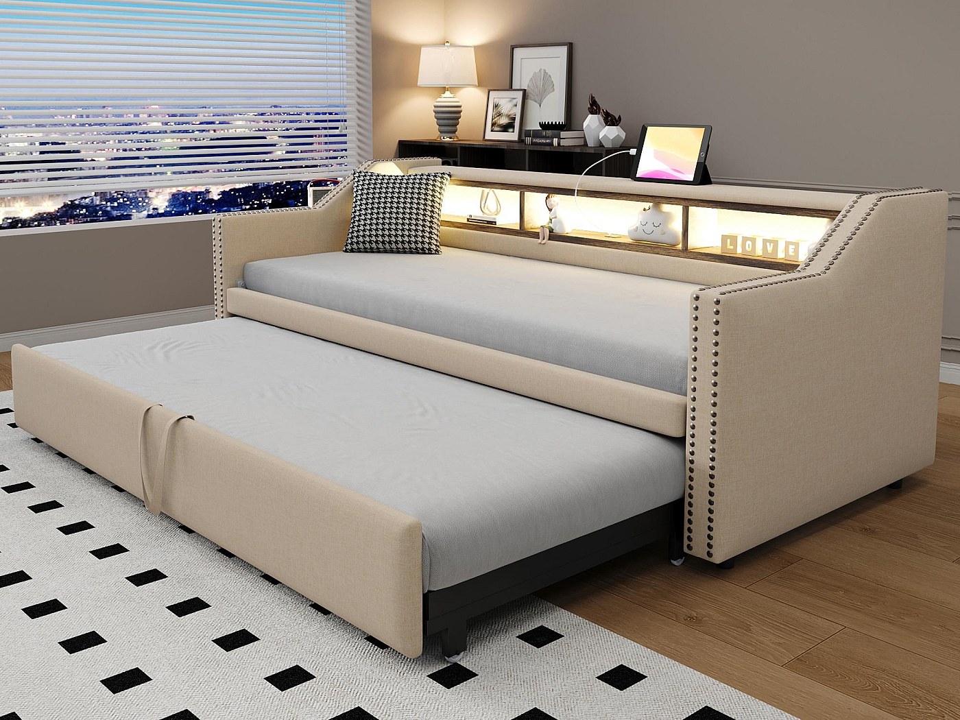 【CONCEPTION PEU ENCOMBRANTE】Ce lit est doté d'un gousset coulissant, ce qui améliore sa fonctionnalité et permet un gain de place. Lit gigogne 140 x 200 cm avec tête de lit en ours, velours, sommier... Trois coloris sont disponibles : beige et gris avec une finition en lin, et rose avec une finition en velours. Idéal pour les petits espaces, les appartements et les chambres d'amis. Lit Enfant Avec Rangement Lit Gigogne Rembourré 90x190cm Lit Jour Enfant Sommier Lattes Lin Gris Sans Matelas Lit Enfant Avec Matelas Le lit gigogne est également équipé de deux barres en U pour empêcher le matelas de bouger et assurer ainsi sa stabilité. Détails du produit : Dimensions hors tout : 99 x 197 x 70 cm (l x L x H) Matériau du panneau : Lin Couleur : Beige Matelas compatible (matelas non inclus) : 90 x 190 cm Épaisseur de matelas recommandée : 13 cm Poids maximal de l’utilisateur : 150 kg / 330 lbs Sommier requis : Non Assemblage requis : Oui Contenu du colis : Lit principal + lit gigogne Poids brut/net : 50,9 kg / 44,88 kg Remarques : ※ En raison des données de mesure manuelles, il peut y avoir une erreur de 2 à 3 cm. Le lit de repos et le lit gigogne peuvent être utilisés avec un matelas de 90 x 190 cm. 【Remarque】 : Le cadre de lit est livré sans matelas et ne nécessite pas de sommier. Il est fourni avec des outils et des instructions de montage simples. Le cadre de lit en L et les panneaux latéraux interchangeables permettent différentes configurations. La barrière avant peut être retirée lorsque l'enfant grandit. Couleur (nuance) : Beige · Matière (précision) : Lin · Taille (couchage) : 90 x 190 cm · Nombre de places : 1 place · Sans matelas · Avec sommier · À monter soi-même... 【CONCEPTION COMPACTE ET PEU ENCOMBRANTE】La forme unique en forme de nuage de ce lit de repos crée une atmosphère idéale pour les enfants. Si des pièces manquent dans votre colis, veuillez contacter le service client. Lit Gigogne 90x190 Cm Gris Clair Bekker - Lit gigogne