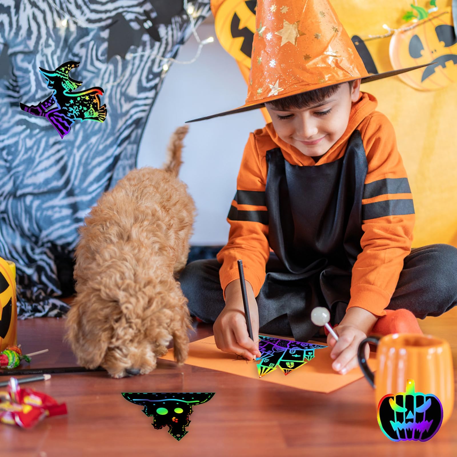 Kit De 36 Pièces De Papier à Gratter Pour Halloween, Citrouilles Magiques Arc-en-ciel, Pour Enfants, Décorations De Fête, Décoration D'Halloween Avec 12 Bâtonnets En Bois Et 36 Rubans Colorés Ces papiers à gratter magiques en 9 motifs de citrouille différents, au total 36 cartes à gratter d'Halloween, les enfants peuvent créer votre propre citrouille d'Halloween, enfiler les peintures à gratter peintes avec une ficelle comme une bannière décorative d'Halloween, ou décorer sur des lanternes citrouille pour ajouter une atmosphère festive à votre Halloween, les enfants vont adorer créer et ramener à la maison leur art à gratter coloré sur le thème d'Halloween. Cadeau Créatif Enfant Activité Créative D’Halloween Pour Les Enfants 👻🎃, Aujourd’hui, On A Créé Une Citrouille En Collant Du Papier Crépon Sur Une Feuille 🍊✂️, Une Activité Toute Simple Mais Qui Fait Son Effet Papier Magique Gratter Décoration Que vous l'offriez comme cadeau, que vous l'utilisiez pour les activités de groupe de fête d'Halloween, les cadeaux de fête d'Halloween, les récompenses en classe, ou l'intégrer dans les loisirs créatifs d'Halloween, il sera sûr d'être un succès auprès des enfants et des parents. Décorez, dessinez et exposez ! ... Chaque kit contient des formes à gratter sur le thème de la sorcière, des outils à gratter et des aimants autocollants Carte à Gratter Enfant 3pcs Papier a Gratter Feuille à Gratter Cartes a Gratter Papier à Gratter... Facile à utiliser : Les couleurs vives du papier à gratter sont cachées sous une couche noire, utilisez seulement le stylet en bois pour dessiner sur la surface noire lisse, laissez libre cours à votre imagination pour gratter d'incroyables chefs-d'œuvre colorés d'Halloween, comme vous le souhaitez. Mode d'emploi Utilisez le stylet en bois pour dessiner sur la surface noire lisse et gratter pour créer vos propres chefs-d'œuvre colorés d'Halloween. Idée de cadeau pour Halloween : Ces cartes à gratter sont d'excellents jouets pour les fêtes d'Halloween, remplir les sacs de fête d'Halloween, Pinata Halloween, activite manuelle halloween enfant, des prix d'Halloween pour les enfants, ou comme une activité amusante pendant les réunions d'Halloween. Il convient aux enfants de tous âges et offre des heures de plaisir créatif. Contenu de l'emballage : Cet art de grattage d'Halloween pour les enfants comprend 36 x papier de grattage de citrouille d'Halloween, 10 x outils de grattage, 36 x corde de couleur. Description du produit Vous cherchez un cadeau unique et attrayant pour les enfants pour Halloween ? Ce kit d'art à gratter d'Halloween est un choix fantastique.