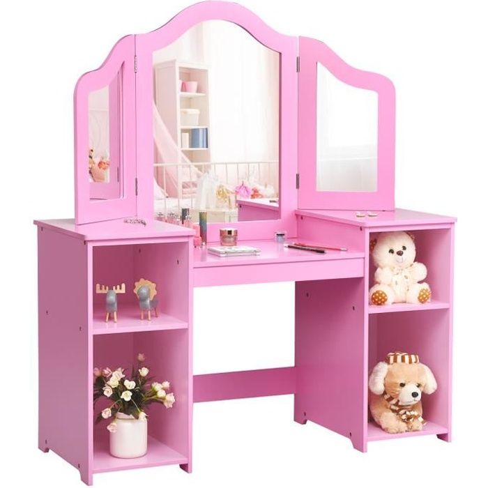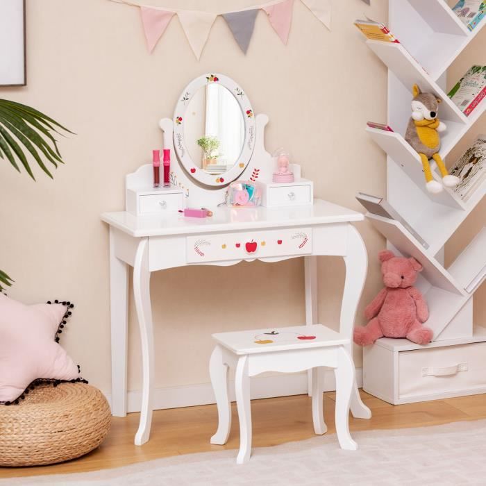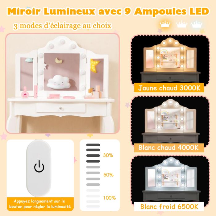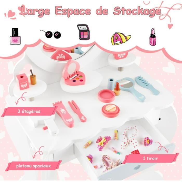 Que ce soit pour peindre, écrire, lire ou se maquiller, ce bureau répond à de nombreux besoins et accompagne votre enfant de manière ludique et créative au quotidien. Fauteuil Enfant DREAMADE Coiffeuse Enfants Fille Avec Tabouret&Lumières LED,2 En 1 Bureau Enfants 3+Ans Avec Miroir&Dispositif Anti-Bascule,Table De Maquillage Princesse Avec 2 Etagères&Tiroir,Charge 50KG (Blanc Bureau Enfant Fille Description : La coiffeuse avec chaise est équipée d'un miroir à éclairage coloré (fonctionne avec 2 piles CR2032, non fournies) qui ajoute une touche de magie au bureau. Avec un miroir LED coloré et un tabouret assorti, il offre aux enfants une expérience de maquillage pratique et agréable. Le bureau et la chaise sont fabriqués avec des matériaux sûrs et présentent une construction robuste pour une longue durabilité L'ensemble comprend également un miroir à main, un peigne et un rouge à lèvres factice, idéal pour les jeux de rôle créatifs. Associé à une étagère, un plateau généreux, un tiroir et une armoire, le bureau pour enfants offre beaucoup d'espace pour les cosmétiques, les jouets et les livres, pour que tout soit toujours bien rangé. GOPLUS Coiffeuse Enfant Fille, Coiffeuse avec 3 Miroir Amovibl et... Miroir avec éclairage coloré — La coiffeuse est équipée d'un miroir à éclairage coloré, créant une atmosphère magique pendant le jeu et stimulant l'imagination des enfants. La coiffeuse pour enfants comprend également un miroir pratique, un peigne et un rouge à lèvres miniature. Chaise confortable — Le dossier inclinable de la coiffeuse favorise une posture saine et assure le confort de votre enfant, même en position assise prolongée. DREAMADE Coiffeuse Enfants Fille avec Tabouret&9 Lumières LED Attractions : Éclairage coloré ajoute une touche de magie Miroir acrylique incassable protège les plus petits Étagère, un plateau spacieux, un tiroir, un compartiment et une bibliothèque de rangement Dossier confortable offre un soutien supplémentaire aux enfants Chaise est renforcée par des traverses pour une stabilité accrue Parfait pour dessiner, écrire, lire ou se déguiser Bords arrondis augmentent la sécurité Spécifications : Couleur : Rose/Blanc + Rose Matériau : MDF, acrylique Dimensions de la table : 86 x 39,5 x 92 cm (L x l x H) Dimensions de la chaise : 27 x 25 x 50 cm (L x l x H) Dimensions de l'assise : 27 x 25 cm (L x l) Dimensions du miroir : 38,5 x 31 cm (L x l) Hauteur de l'assise : 28 cm Poids net total : 18 kg Capacité de poids de la coiffeuse : 50 kg Capacité de poids du tabouret : 75 kg Âge recommandé : 3+ ans Livraisons : 1 x Coiffeuse 1 x Chaise 1 x Miroir 1 x Peigne 1 x Rouge à lèvres 1 x Mode d'emploi Utilisation polyvalente — Cette coiffeuse convient aux enfants de 3 ans et plus et impressionne par sa polyvalence.
