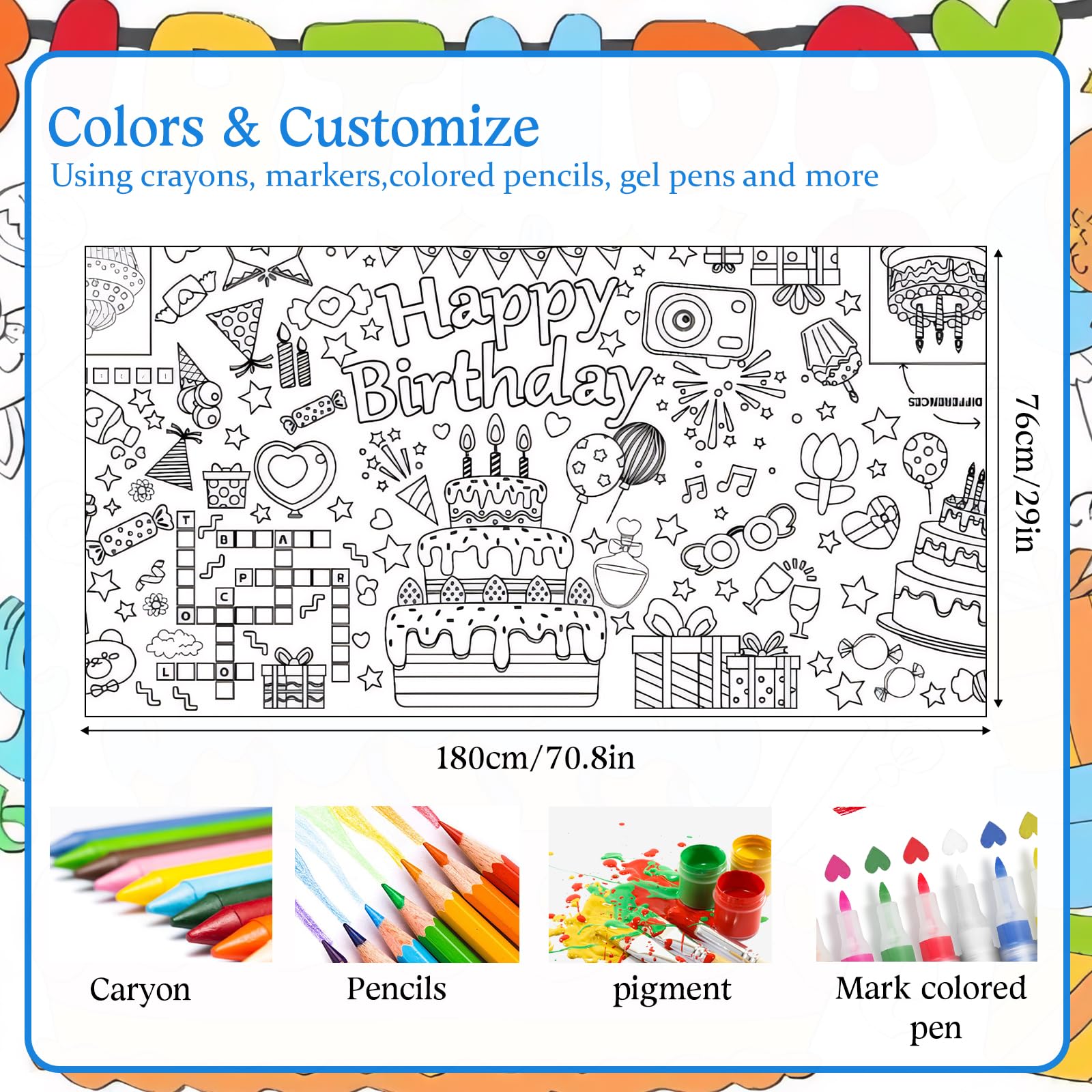 Nappe Papier Créative Set De Table à Colorier Fête D'anniversaire Pour Enfants, Modèle Modifiable, Coloriage De Gâteau D'anniversaire, Feuille D'activités Manuelles, Tapis De Table, Jeux à Imprimer - France Feuille De Coloriage Pour Table D'anniversaire La nappe peut protéger votre table de salle à manger, empêcher les objets durs de se rayer, nappe très utile pour un anniversaire. Polyvalente et adaptable pour divers événements et rassemblements, ce qui en fait un ajout polyvalent à toute occasion nappe en papier d'anniversaire nappe à colorier lavable indien Développement des compétences : aide au développement créativité et des compétences artistiques, ce qui en fait un outil pour l'apprentissage et plaisir, coloriage de nappes pour enfants, nappes en papier Nappe de coloriage Happy Birthday. Cette grande feuille de coloriage peut être étalée sur une table ou accrochée comme affiche, offrant une activité amusante et interactive pour les jeunes invités. Notre nappe de coloriage est le bel ajout à toute fête d'anniversaire. Nappes pour fêtes. Les motifs Happy Birthday sont sûrs de ravir, les encourageant à travailler ensemble pour... Protection de table : agit comme une housse de protection pour protéger vos meubles des marqueurs, crayons et autres fournitures d'art, bannière de coloriage en papier, nappe de coloriage pour enfants Nappe pratique : sert également de nappe, protégeant votre table des fournitures d'art et rendant nettoyage de simple et rapide, nappe à colorier, affiche d'anniversaire Décorations attrayantes : les décorations détaillées sur l'affiche captivent l'attention et encouragent un engagement prolongé, affiche à colorier , affiche de nappe en papier à colorier bannières à colorier d'anniversaire Étalez-la sur une table ou accrochez-la au mur et laissez les enfants leurs talents artistiques