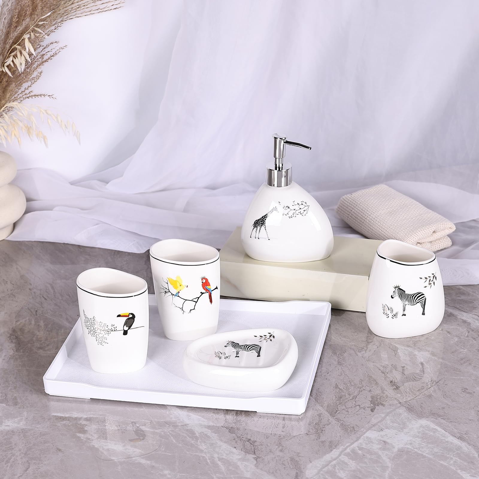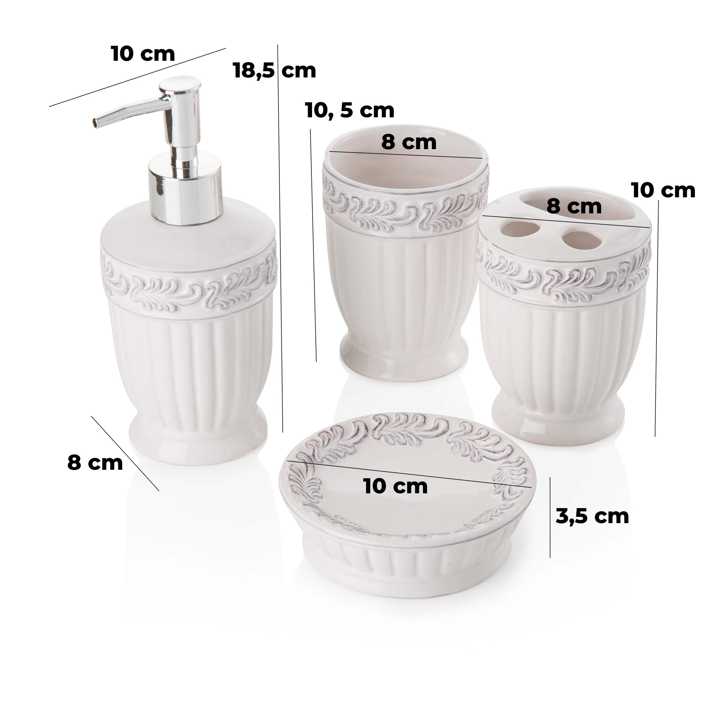 - Motif : style simple., - Style : moderne., - Couleur : blanc. Set d'accessoires de salle de bains avec distributeur, porte-brosse à dents et porte-savon en céramique blanche, ligne ParigiLa ligne d'accessoires Parigi en céramique colorée se caractérise par une praticité d'utilisation alliée à un design très innovant. Ce set est composé d'un distributeur de savon liquide d'une capacité de 500 ml, d'un porte-brosse à dents et d'un porte-savon... - 1 distributeur de savon en céramique. Caractéristiques : - Matériau : céramique. Distributeur Savon Porte-savon Gobelet Ensemble D'Accessoires De Salle De Bain 6 Pièces - Distributeur, Porte Distributeur De Savon Blanc Extérieur Lot de 4 distributeurs de savon. 【Garantie après-vente】Merci d'avoir choisi. Contenu du paquet : 1 x housse de chaise. Ensemble chic pour ustensiles de salle de bain, design élégant et agréable au toucher. Il est également facile à nettoyer, essuyez-le avec un chiffon doux ou rincez-le simplement à l'eau En détail, comme suit : 1., Distributeur de savon : design élégant et agréable au toucher., 2., Porte-savon : le porte-savon est non seulement fonctionnel, mais aussi esthétique., 3., Gobelet à brosse à dents : le gobelet de brosse à dents est assez spacieux pour contenir plusieurs brosses à dents et dentifrice. - Type : distributeur de savon. Ensemble distributeur savon 4 Pièces D'accessoires de Salle de Bain... Si vous rencontrez des problèmes avec le produit, nous vous répondrons à votre e-mail dans les 24 Lot de 4 accessoires de salle de bain, c'est la solution parfaite pour vous. Bon cadeau : les accessoires de salle de bain de luxe sont également un cadeau pour la famille, les amis et les collègues de travail ; bon comme cadeau de pendaison de crémaillère, cadeau de mariage, ou pour les rénovateurs qui cherchent à améliorer la salle de bain dans leur maison ou leur appartement ; essentiels de salle de bain pour nouvel appartement ; décoration de salle de bain d'invités SPORWAY Distributeur de savon liquide vaisselle