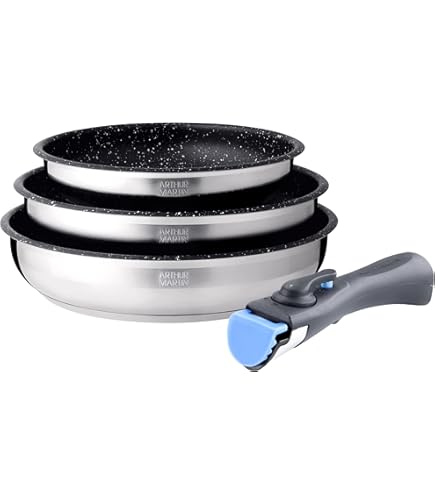 Poignée Amovible Rangement Empilable Ensemble De 3 Poêles à Frire 18/22/26 Cm SAN IGNACIO Collection Jolie Poêles Smart Clip Rangement Empilable Bleu Dans le set : des poêles de 20, 24 et 28 cm, et des casseroles de 16, 18 et 20 cm. Le tout dans un joli bleu marine. Idéal pour les petits espaces, les... de Buyer Acier Carbone Plus poêle à frire, 22 cm 5110.22 | Achetez à POIGNÉE AMOVIBLE : La poignée amovible qui reste froide se verrouille en toute sécurité lorsque vous cuisinez et se détache facilement pour un rangement empilable. Ensemble de poêles à frire antiadhésives à anodisation dure ZWILLING... CONVIENT À L'INDUCTION : Cet ensemble de poêles convient à tous les types de cuisinières et est toujours prêt à l'emploi. Adapté à toutes les cuisinières, y compris à induction, ce set est fourni avec une poignée clipsable pour un rangement empilable intelligent. ENSEMBLE DE 3 PIÈCES : le Set de Poêles Russell Hobbs Smart Clip 3 Pièces comprend deux poêles à frire (22 cm et 26 cm) et une poêle à sauté de 24 cm. Toutes fabriquées en aluminium pressé résistant, ces poêles offrent une excellente répartition de la chaleur pour une cuisson uniforme et possèdent un revêtement antiadhésif pour un démoulage facile des aliments.